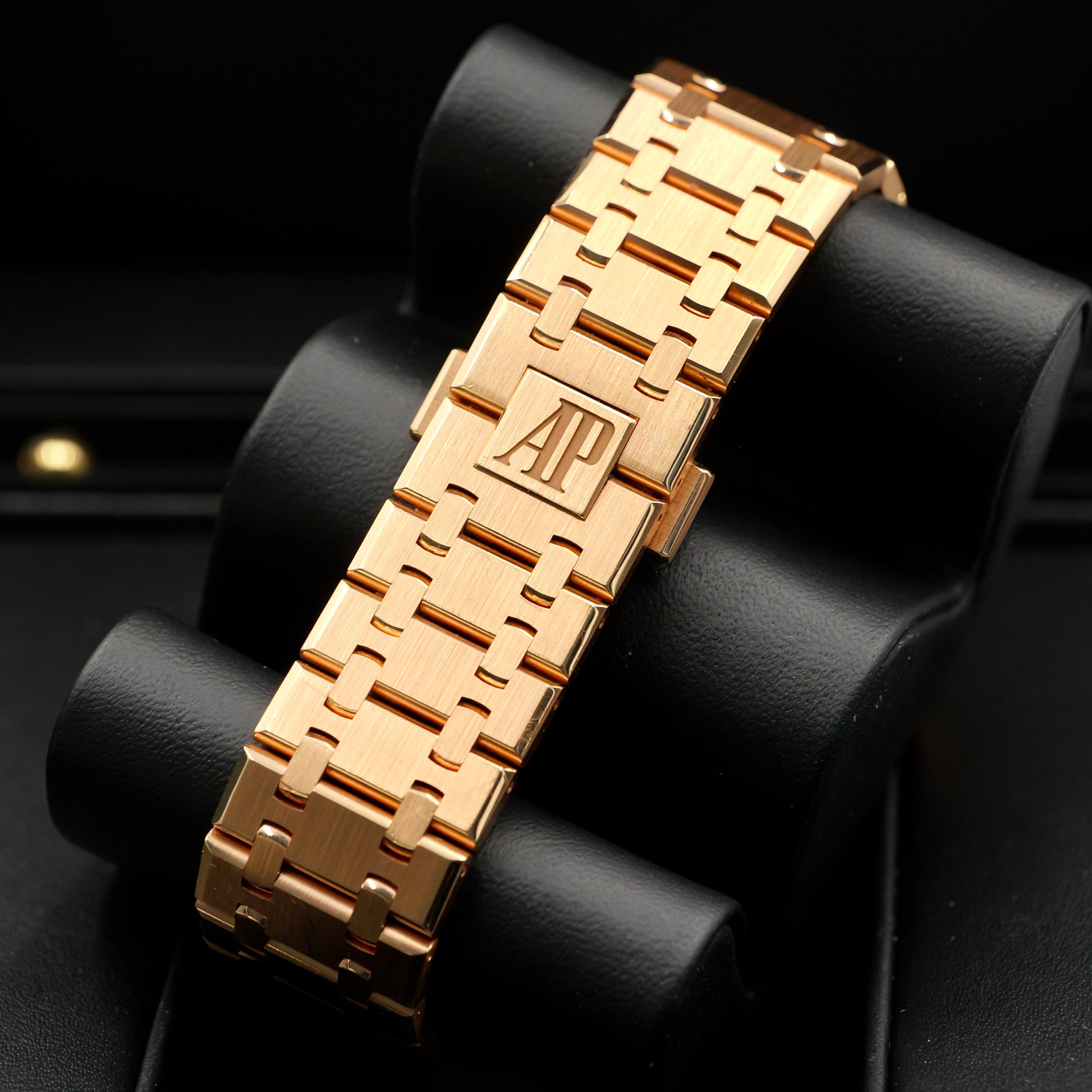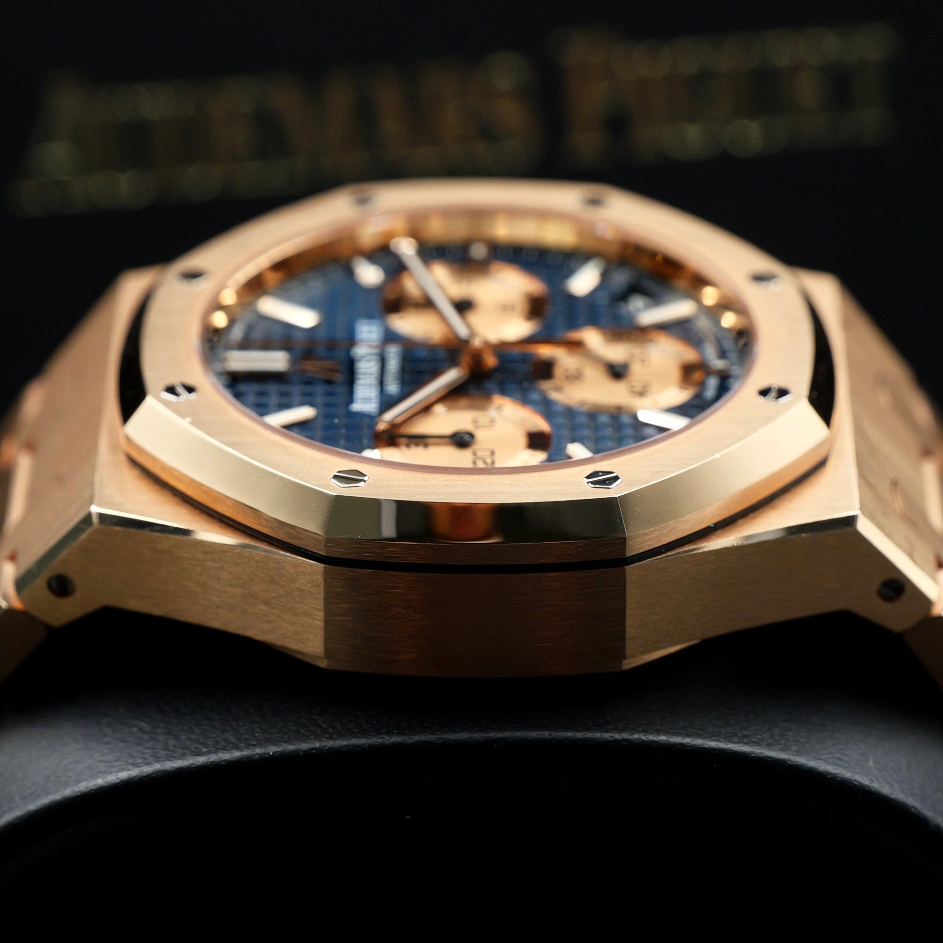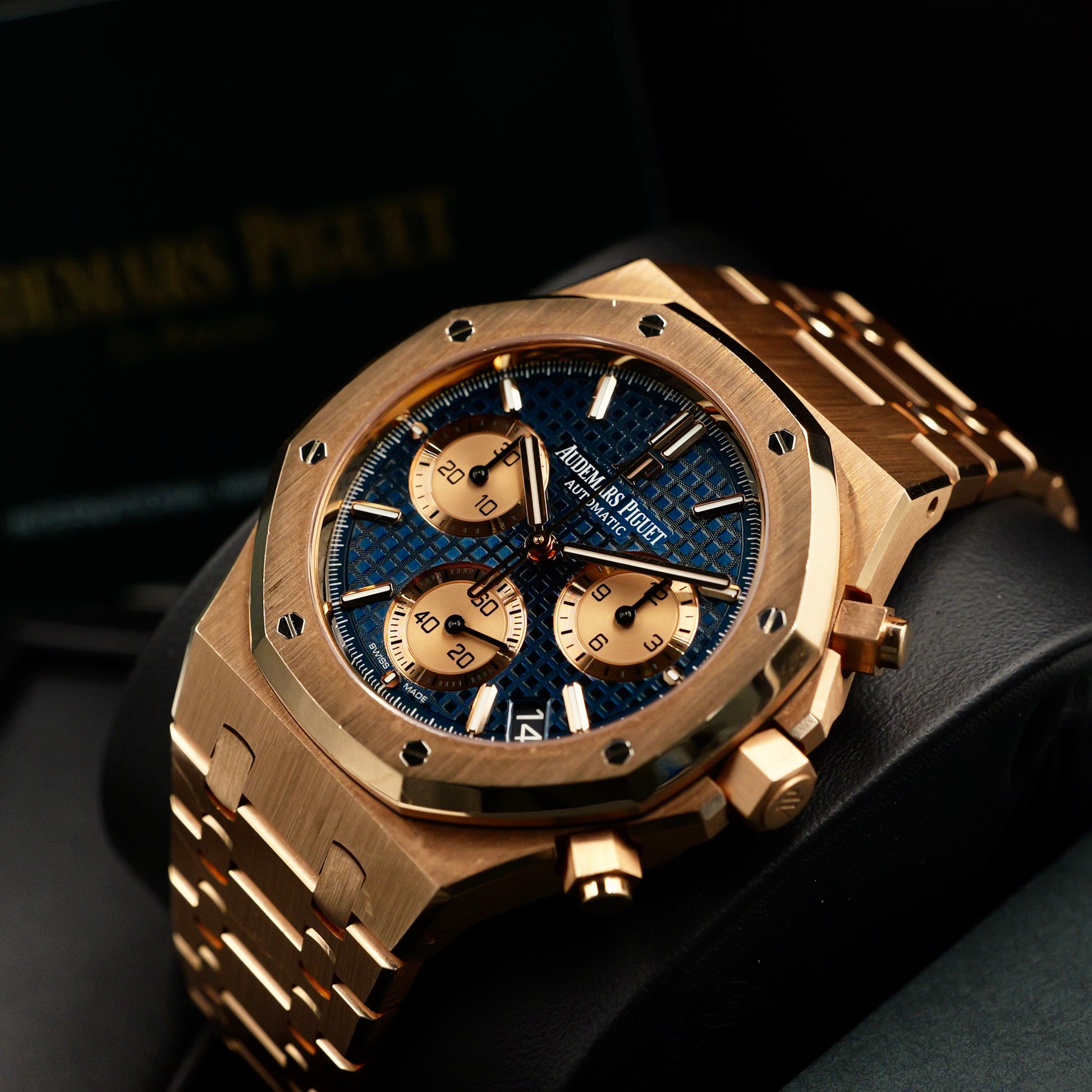 The 41 mm case showcases AP’s celebrated mix of satin brushing and polished bevels, framed by the signature octagonal bezel secured with eight white-gold screws. The blue dial offers exceptional depth, featuring the Royal Oak’s signature embossed texture, pink-gold applied hour markers, and three silver-toned chronograph sub-dials that ensure precise, easy-to-read timing.