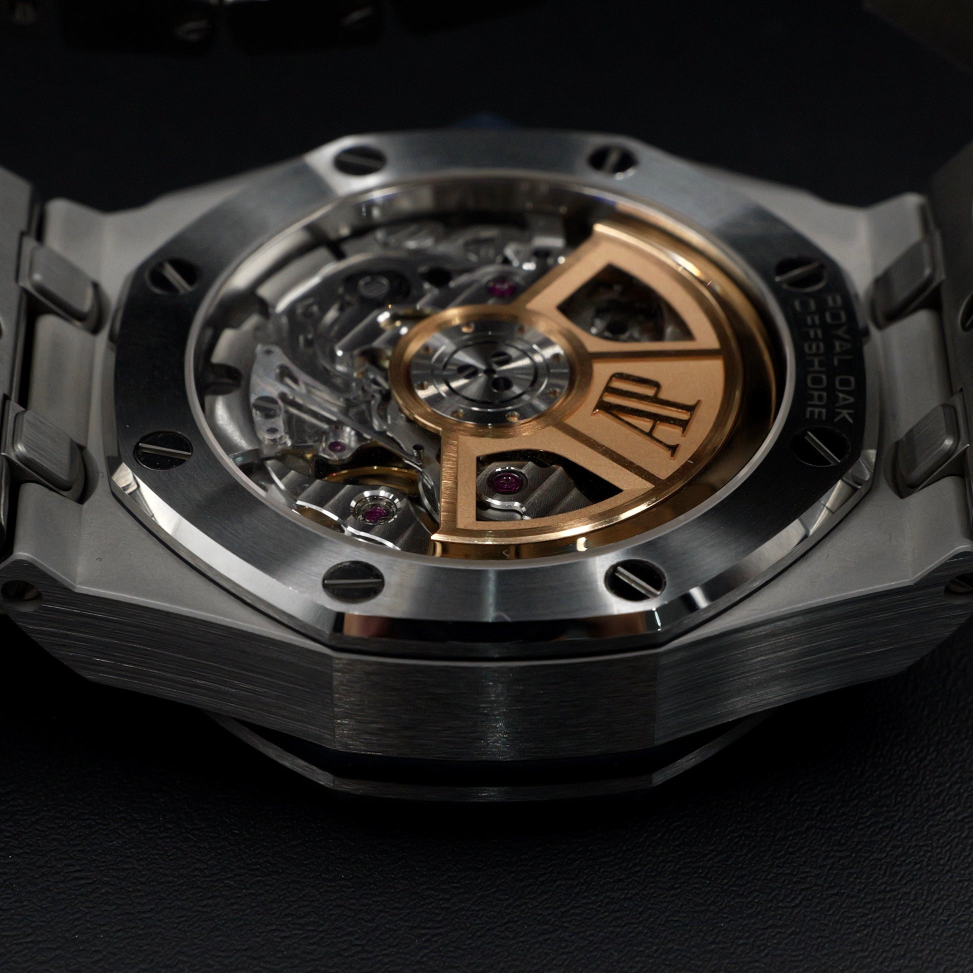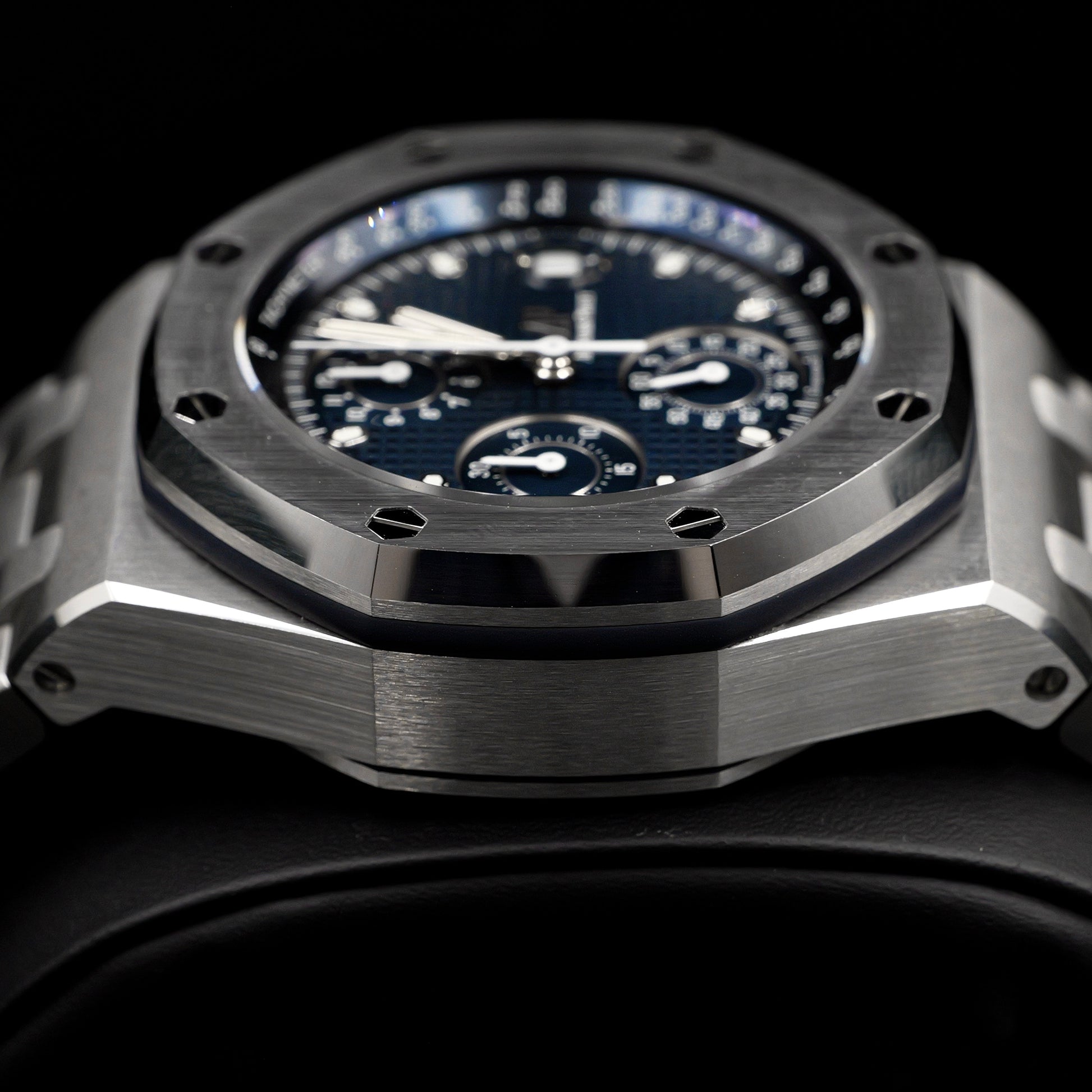 The 41 mm brushed steel case is complemented by polished bevels, showcasing AP’s celebrated finishing artistry. The chronograph layout features three silver-toned sub-dials for perfect contrast and clarity, while luminescent white gold hands and hour markers ensure flawless legibility in any light.
