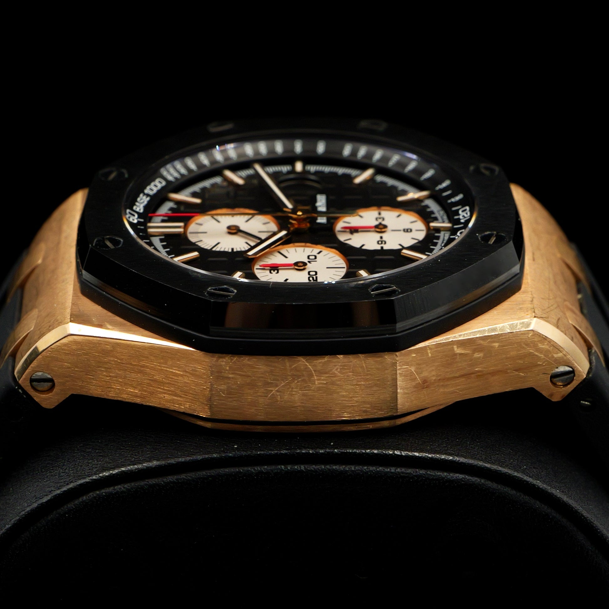 The Audemars Piguet Royal Oak Offshore Chronograph 26400RO in 18ct rose gold is a bold expression of technical mastery and modern luxury. Crafted for those who demand presence on the wrist, this timepiece redefines sport elegance with its striking contrasts and iconic design.