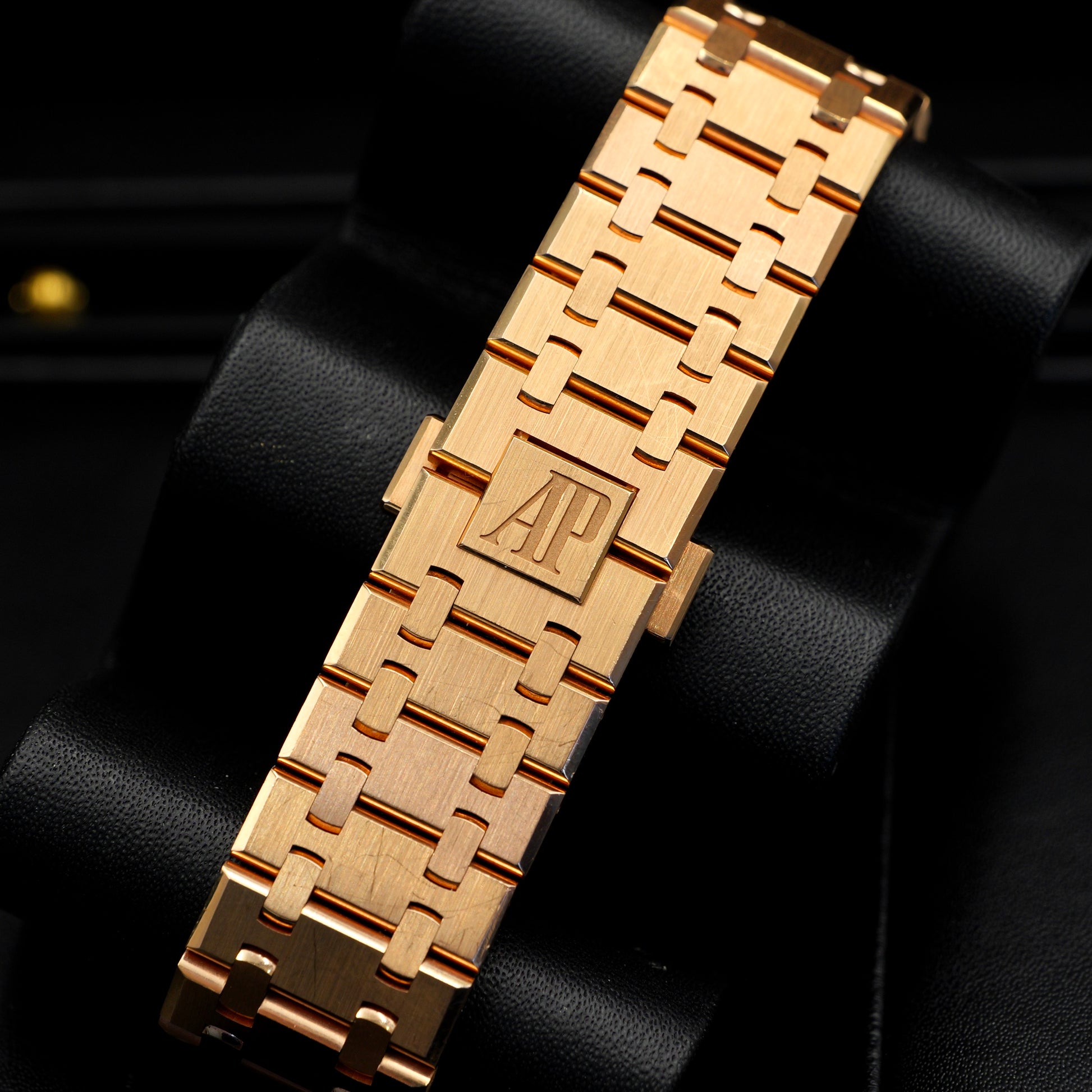 The Audemars Piguet Royal Oak 15400OR in 18k rose gold is a striking fusion of refined aesthetics and iconic design. Its 41mm case, meticulously hand-finished with satin brushing and polished bevels, is framed by the legendary octagonal bezel with exposed white gold screws, delivering a powerful and instantly recognizable presence.