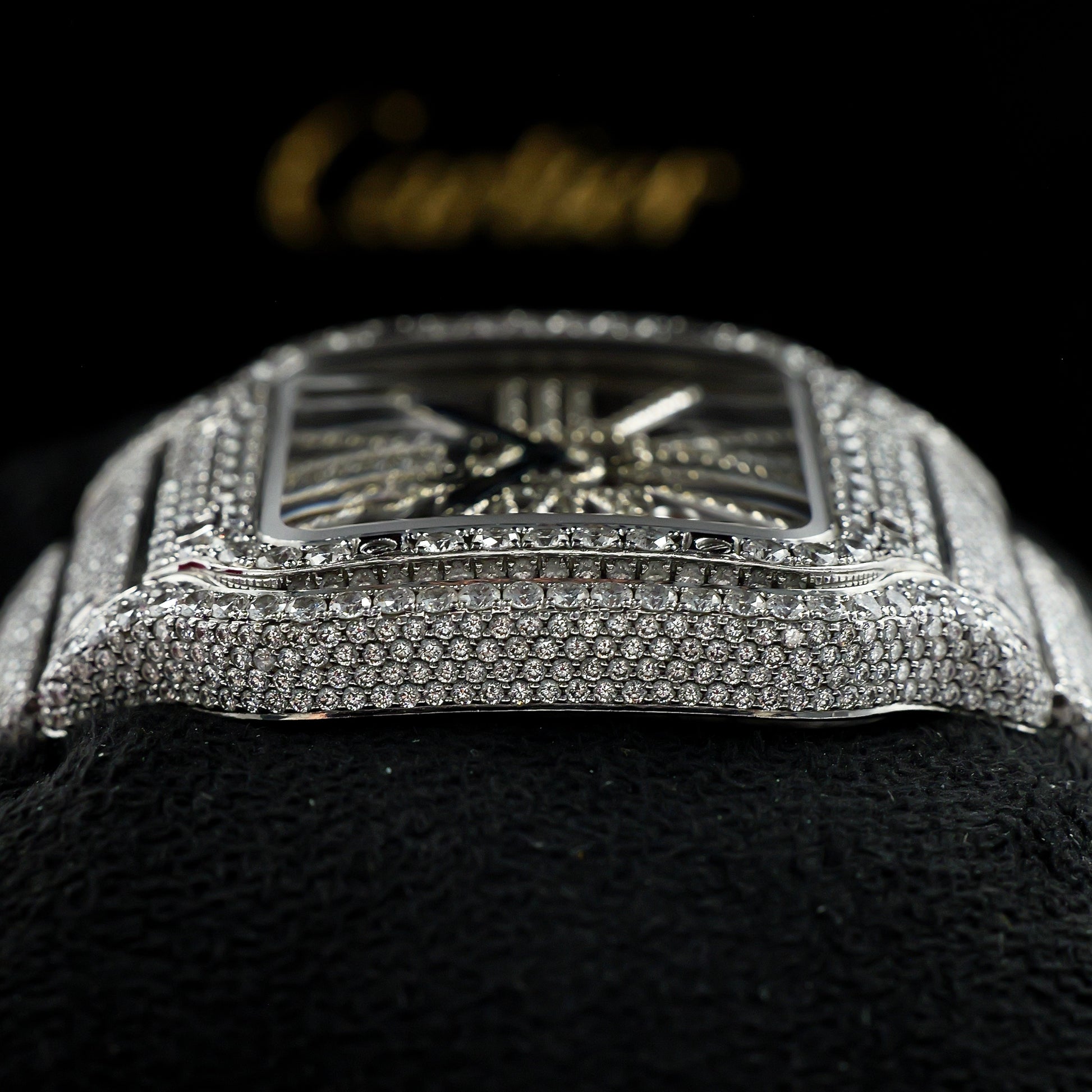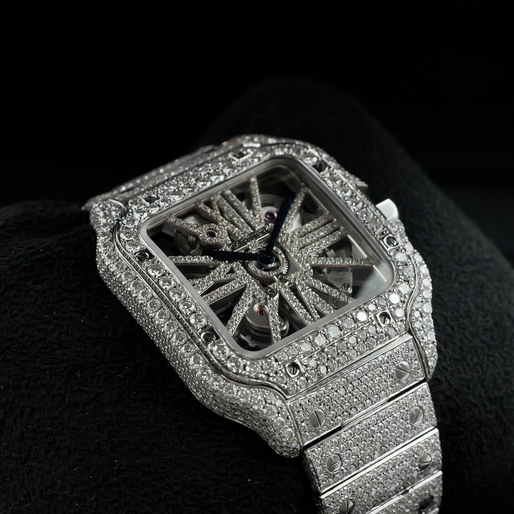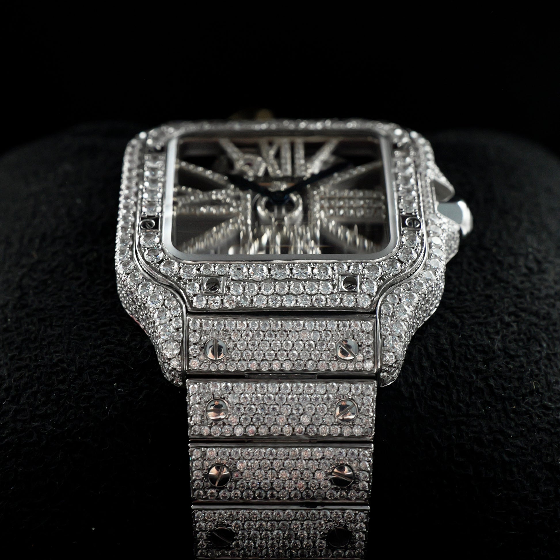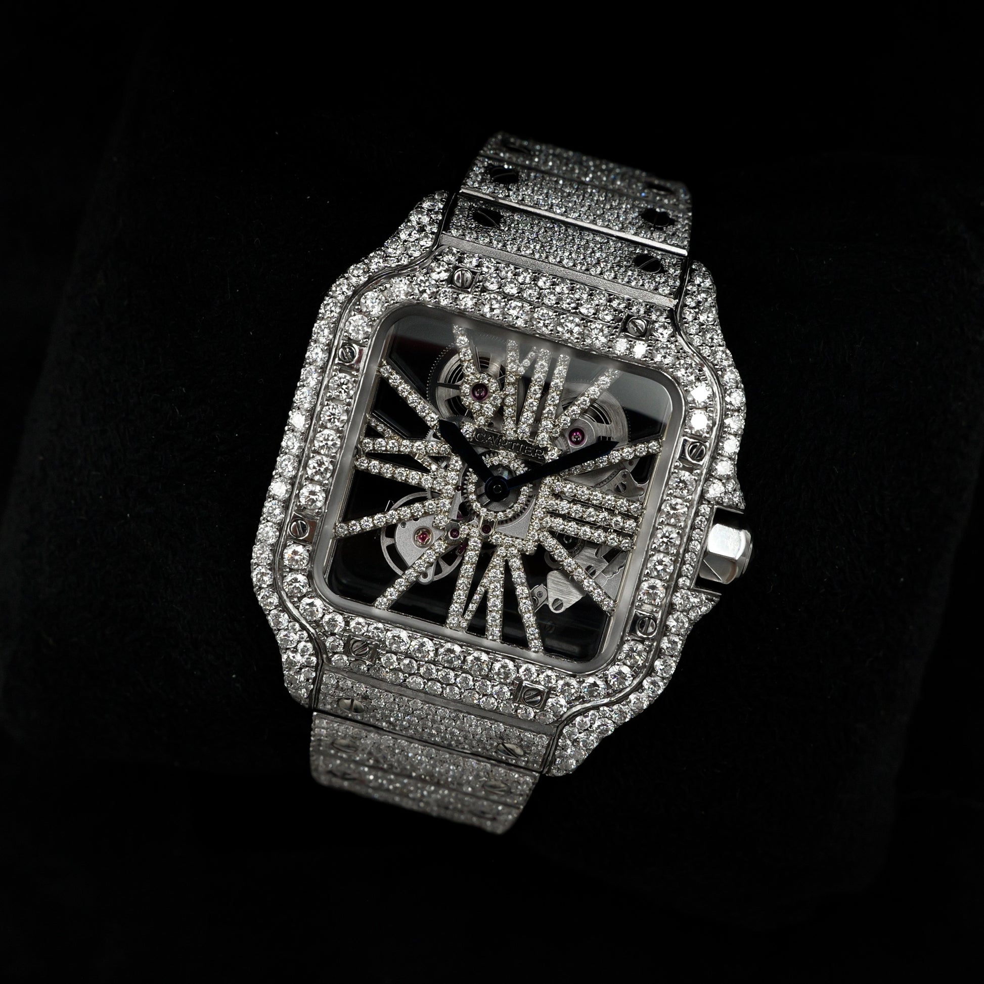 This Cartier Santos Skeleton has been transformed into a bold, statement-making timepiece through a full aftermarket diamond setting, elevating one of Cartier’s most iconic designs into the realm of high-impact luxury. Combining the unmistakable square Santos silhouette with an openworked skeleton dial and full pavé diamonds, this watch delivers exceptional wrist presence and modern flair.