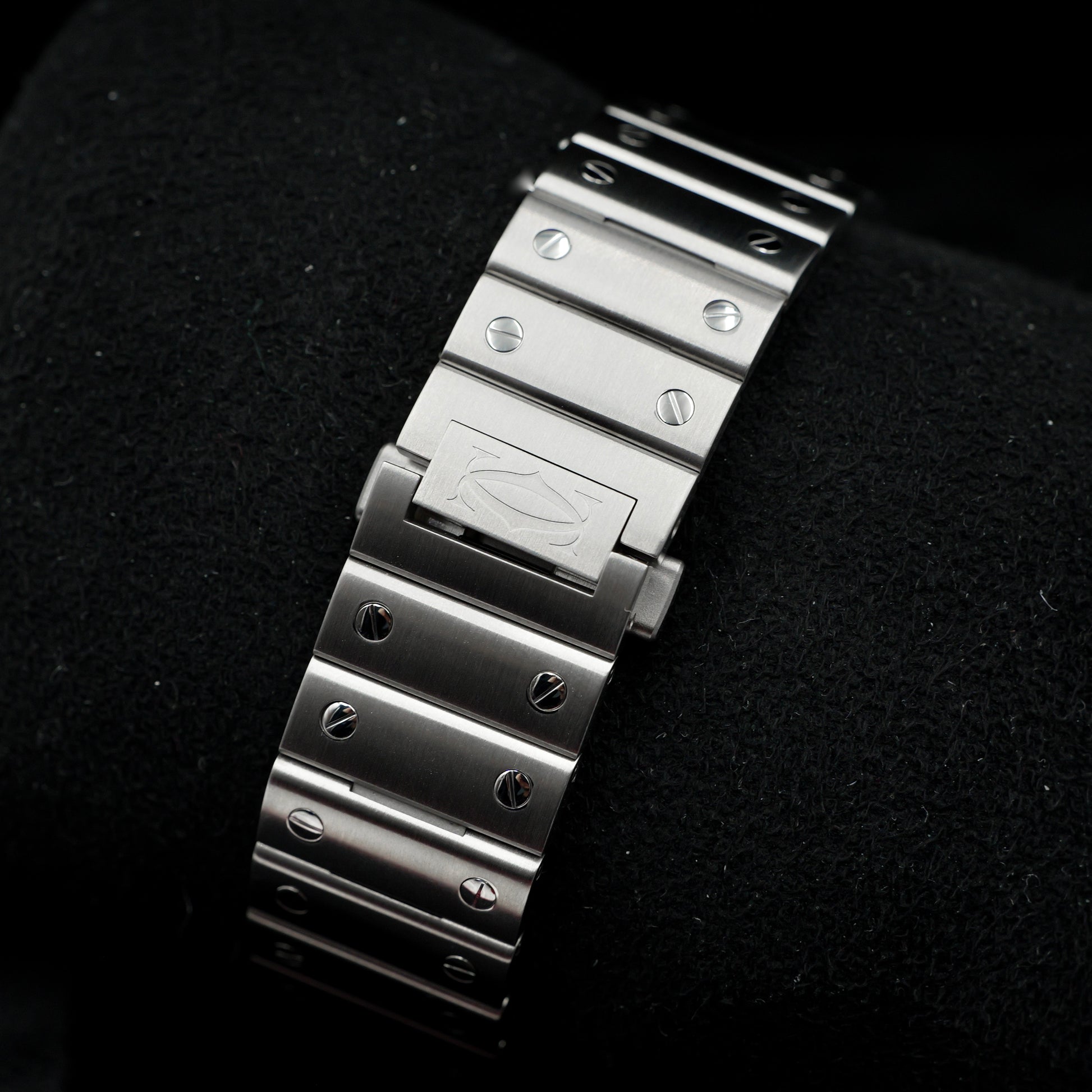 The stainless steel case showcases the Santos’ signature square silhouette with softly rounded edges, exposed bezel screws, and refined brushed and polished finishes. Balanced proportions ensure a confident yet elegant presence on the wrist, making it suitable for both daily wear and formal occasions