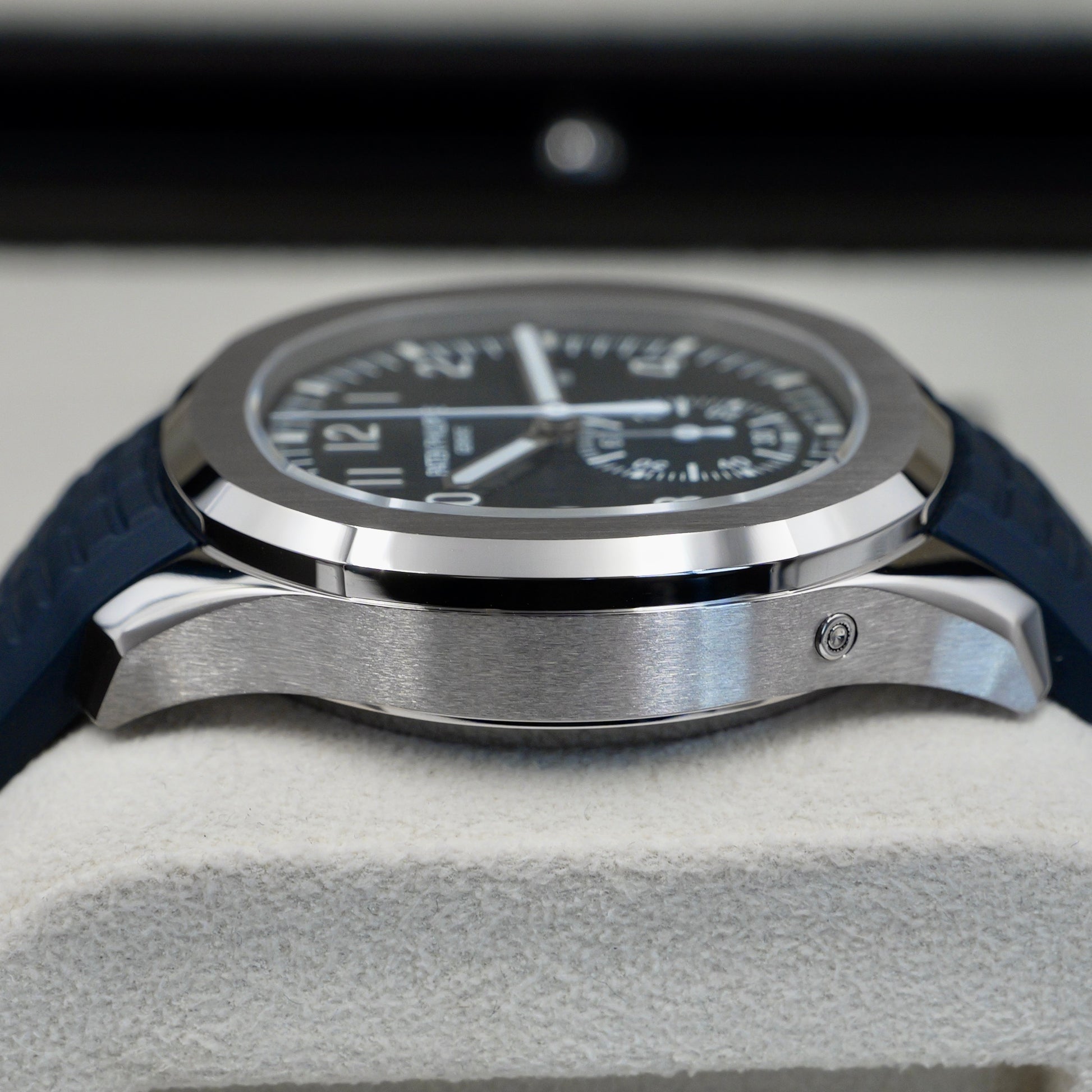 The 42.2 mm white-gold case features the Aquanaut’s signature rounded-octagonal shape, finished with a sophisticated mix of satin brushing and polished bevels. Its substantial yet ergonomic profile offers a confident wrist presence while remaining exceptionally comfortable.