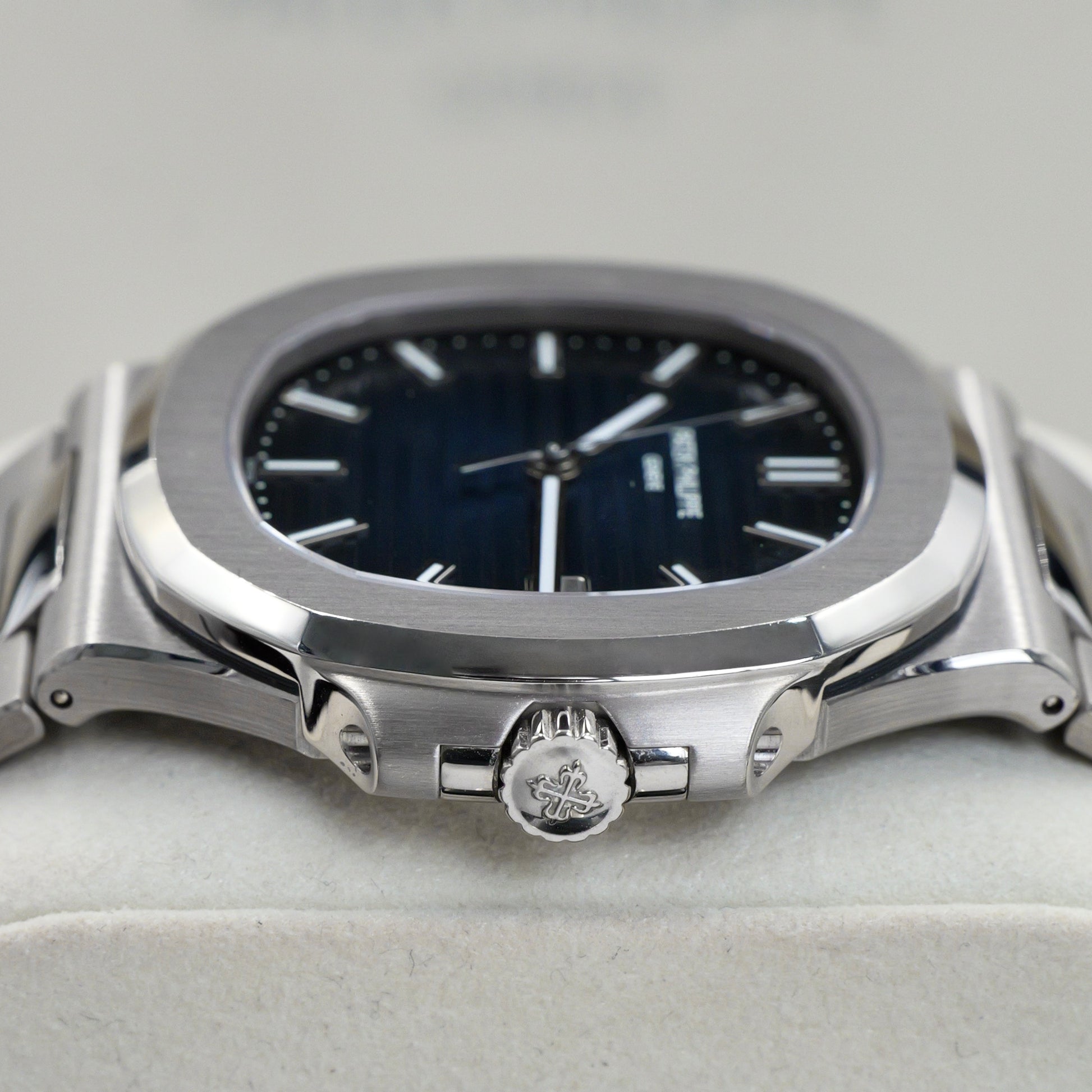 The 41 mm case, crafted from solid white gold, maintains the Nautilus’s signature rounded octagonal bezel and porthole-inspired design, now featuring a two-part construction for improved servicing and robustness. The sunburst blue dial deeply saturated with a gradient that darkens toward the edges displays the signature horizontal embossing, applied white-gold hour markers, and luminous hands for exceptional legibility and visual depth.