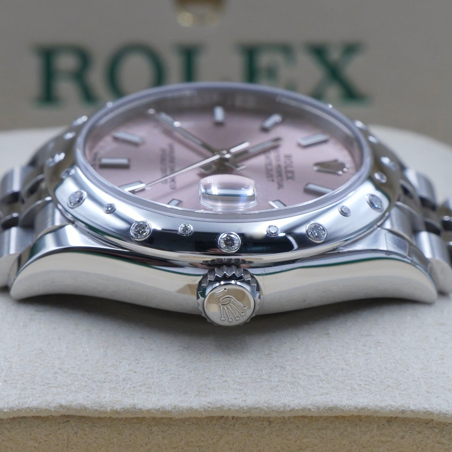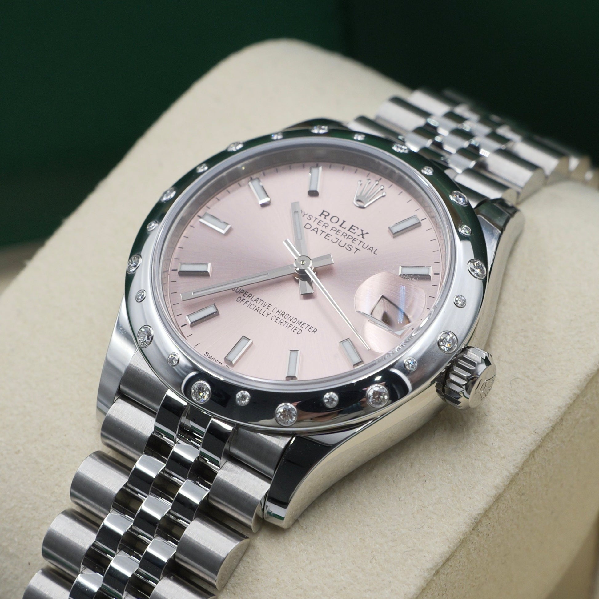 The Rolex Datejust 31 reference 278344RBR is a stunning expression of refined luxury, combining classic Datejust elegance with dazzling diamond craftsmanship. Crafted from Oystersteel and solid 18 ct white gold, this configuration pairs a soft pink sunray dial with a factory diamond-set domed bezel, creating a timepiece that is both timeless and unmistakably sophisticated.