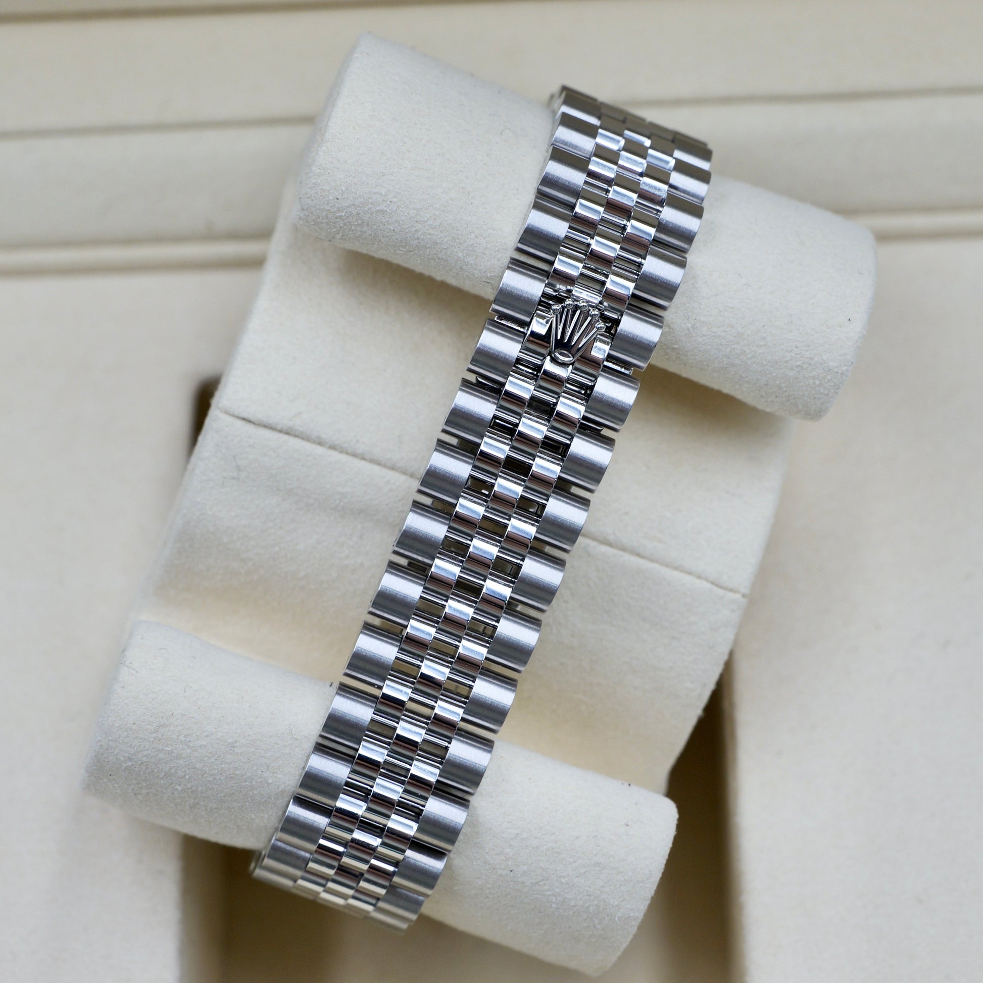 The 31 mm Oyster case offers perfectly balanced proportions, polished to a mirror finish and crowned with a domed bezel meticulously set with brilliant-cut diamonds. This radiant frame enhances the watch’s jewelry-like presence while maintaining the unmistakable identity of the Datejust collection.