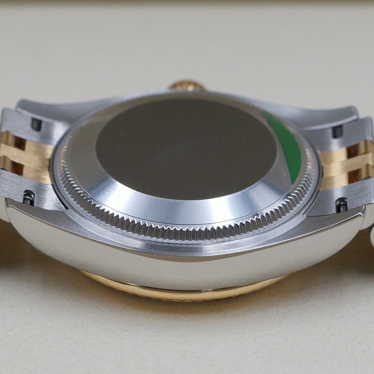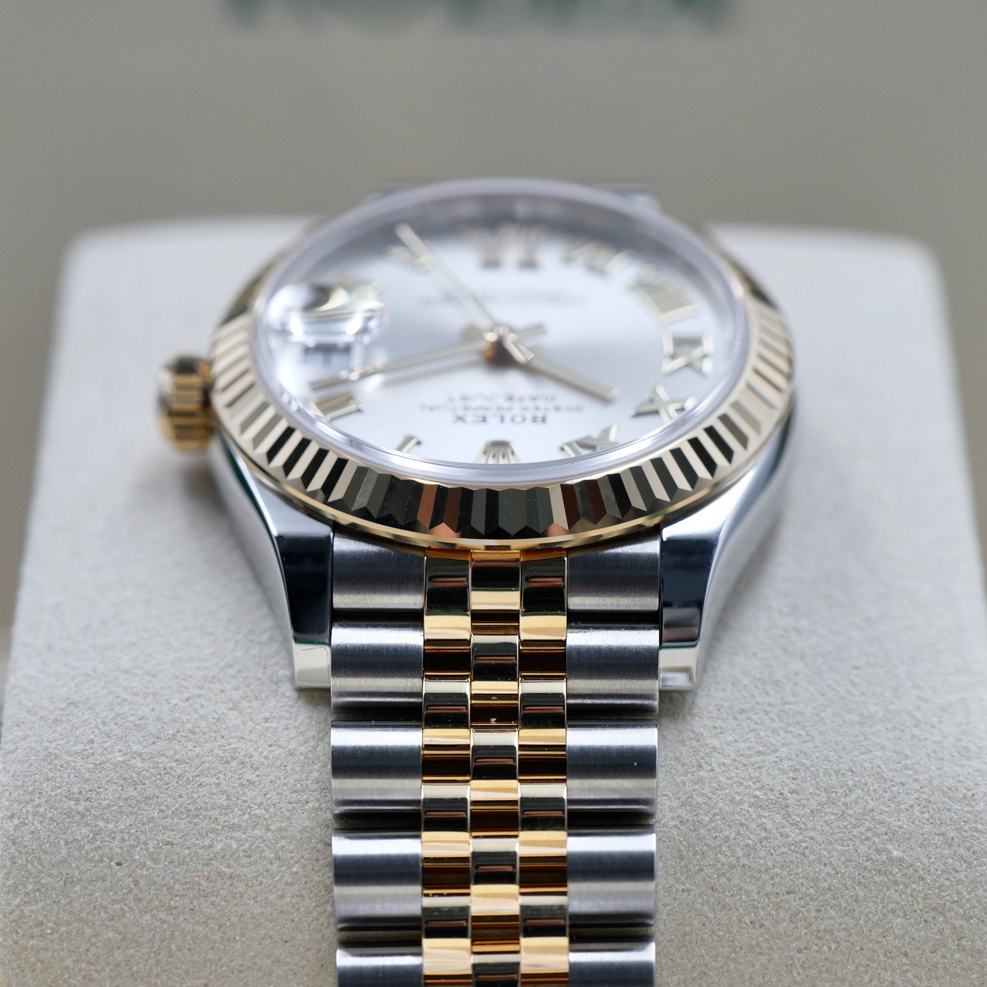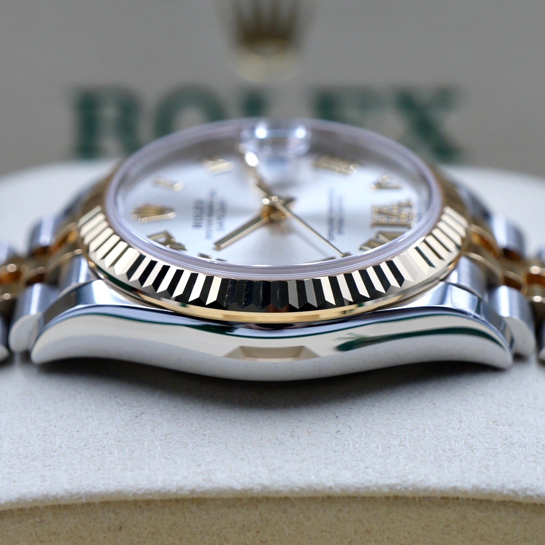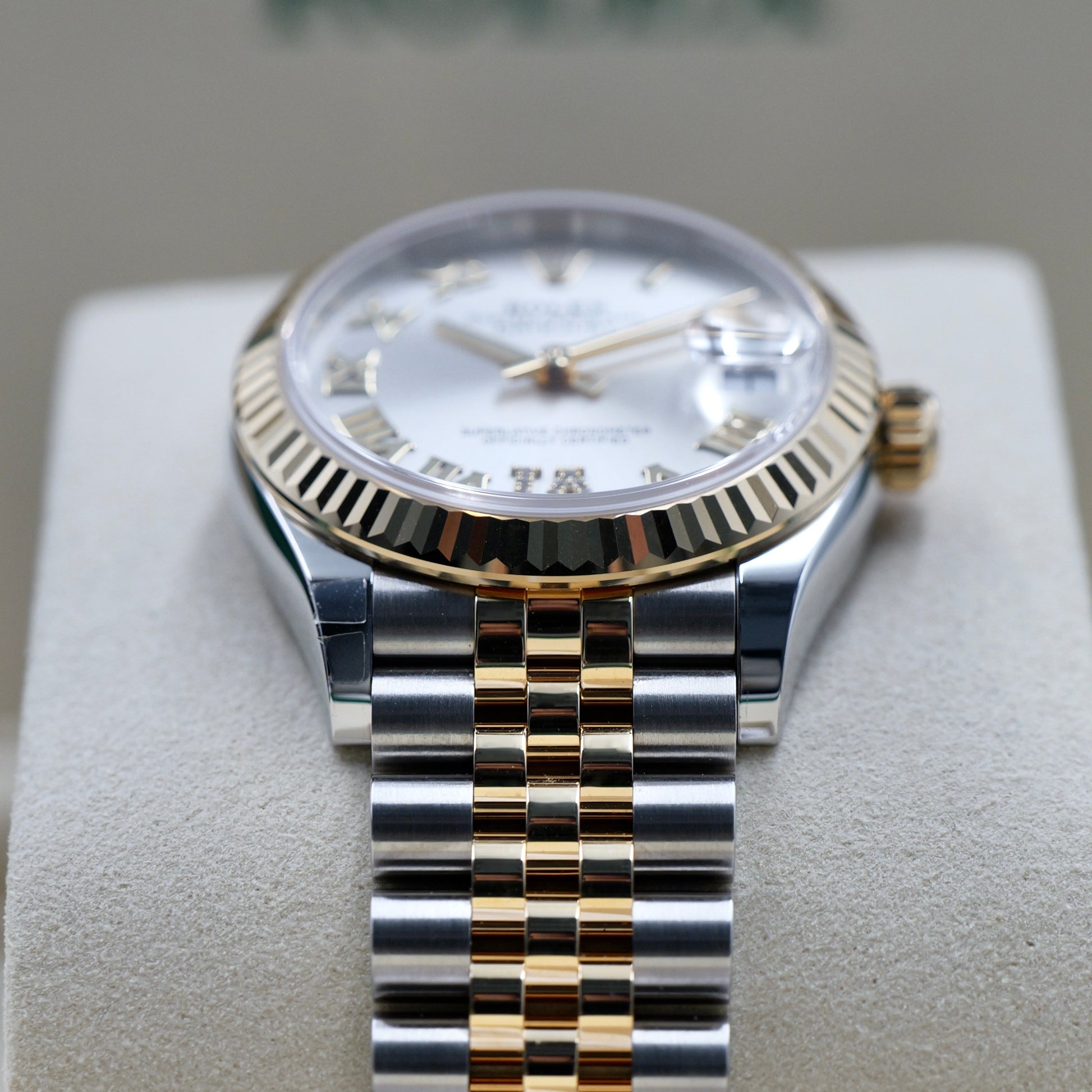 The 31 mm Oyster case offers balanced proportions and versatile wearability, combining polished steel with the warmth of yellow gold. The iconic fluted yellow-gold bezel reflects light beautifully, framing the dial with unmistakable Rolex character. This dial features applied gold hour markers and hands for crisp legibility, while the brilliant-cut diamond set at 6 o’clock introduces a refined focal point that enhances the watch’s sophistication.