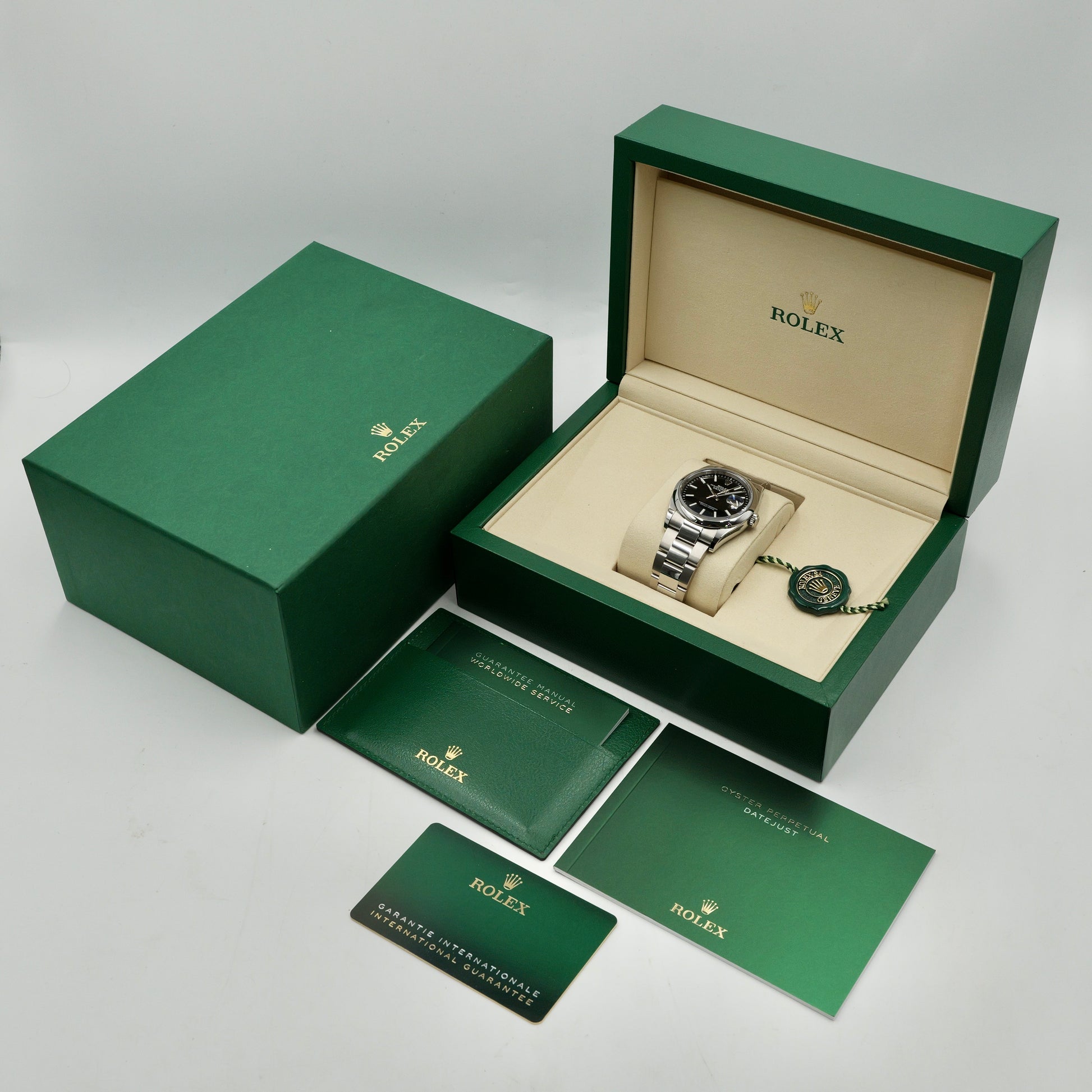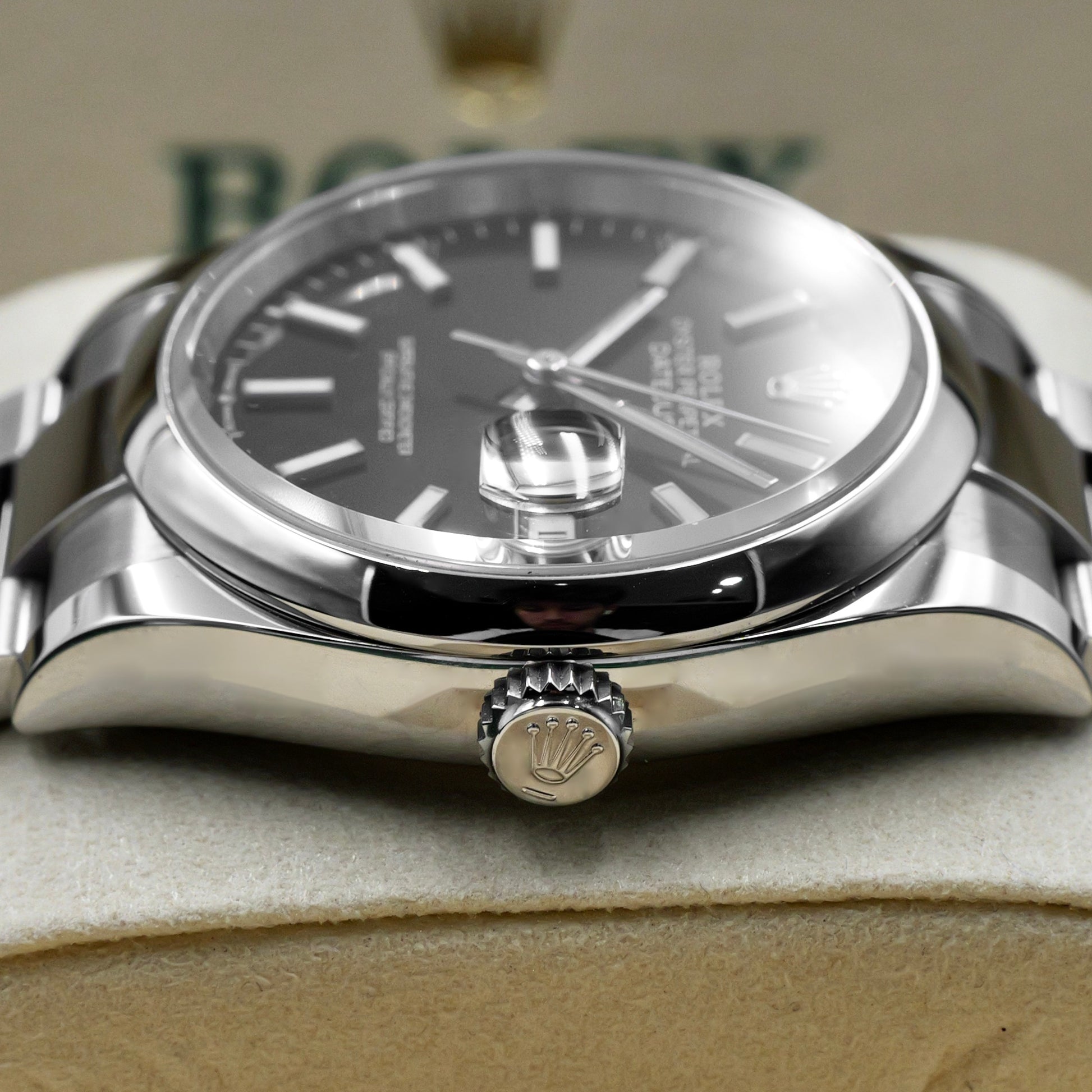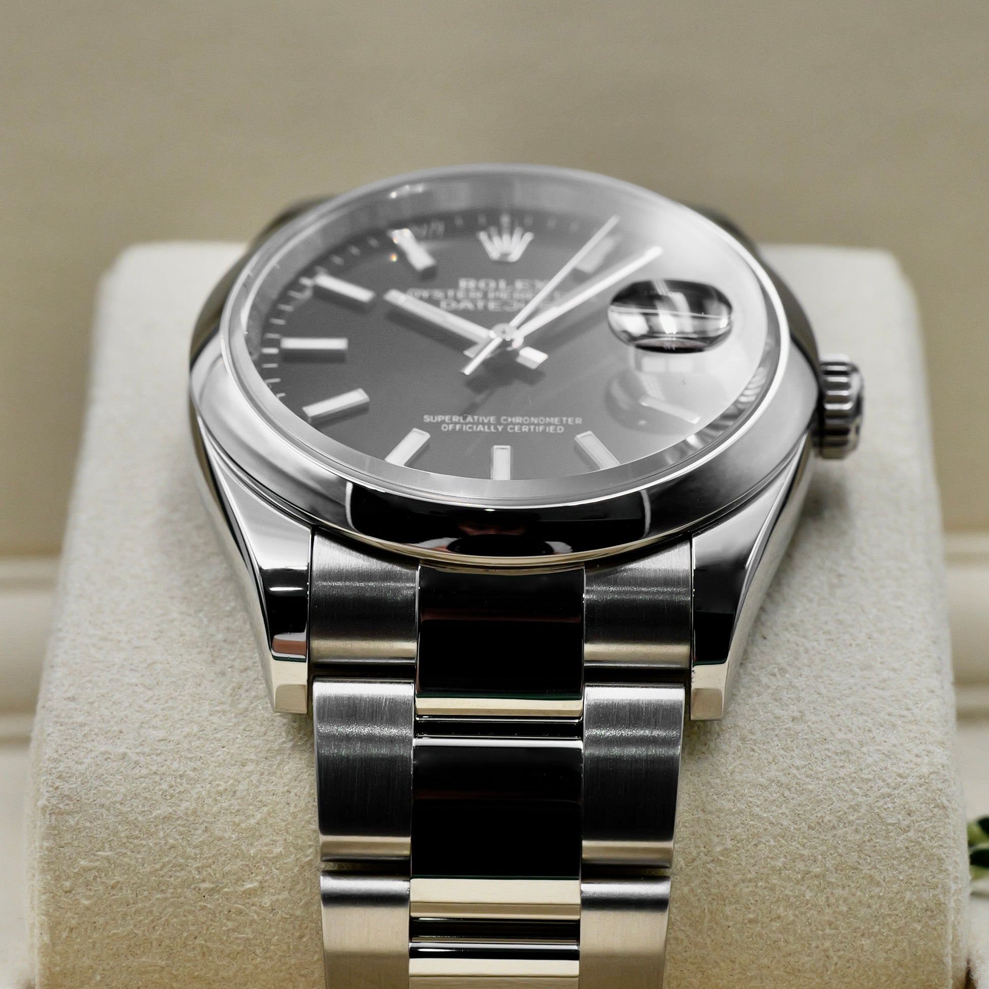 The 36mm Oyster case, crafted from corrosion-resistant Oystersteel, delivers a sleek and balanced profile—ideal for both casual and formal wear. Its smooth polished bezel offers a clean, contemporary touch, while the striking sunray-finished Black dial plays beautifully with light. Applied baton hour markers, crafted in white gold and filled with Chromalight, ensure legibility and modern sophistication.