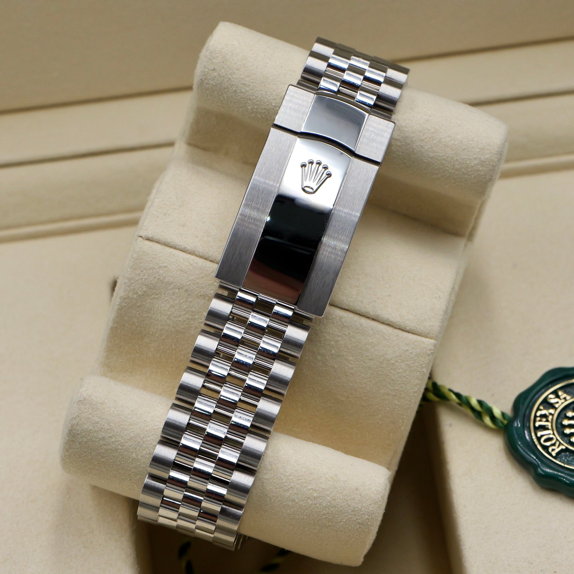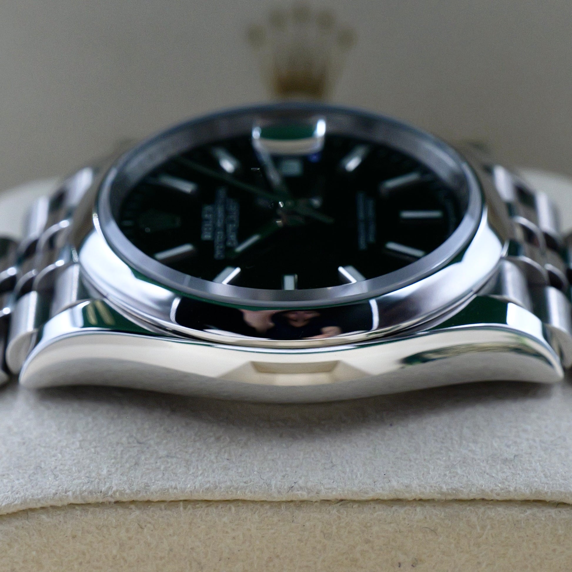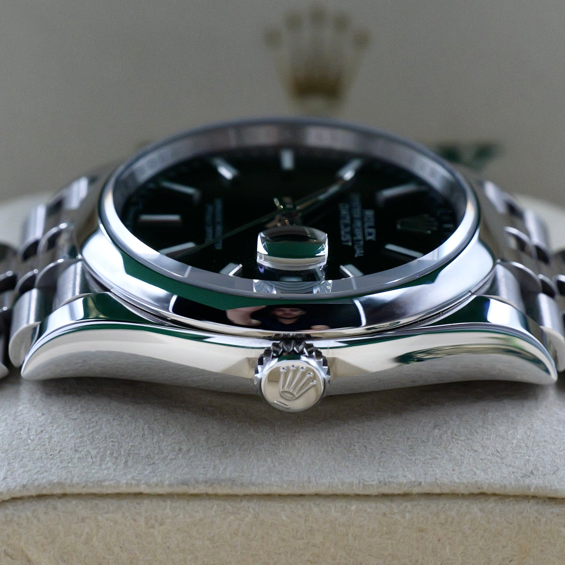 The 36mm Oyster case, crafted from corrosion-resistant Oystersteel, delivers a sleek and balanced profile ideal for both casual and formal wear. Its smooth, polished bezel offers a clean, contemporary touch, while the striking sunray-finished Black dial plays beautifully with light. Applied baton hour markers, crafted in white gold and filled with Chromalight, ensure legibility and modern sophistication.