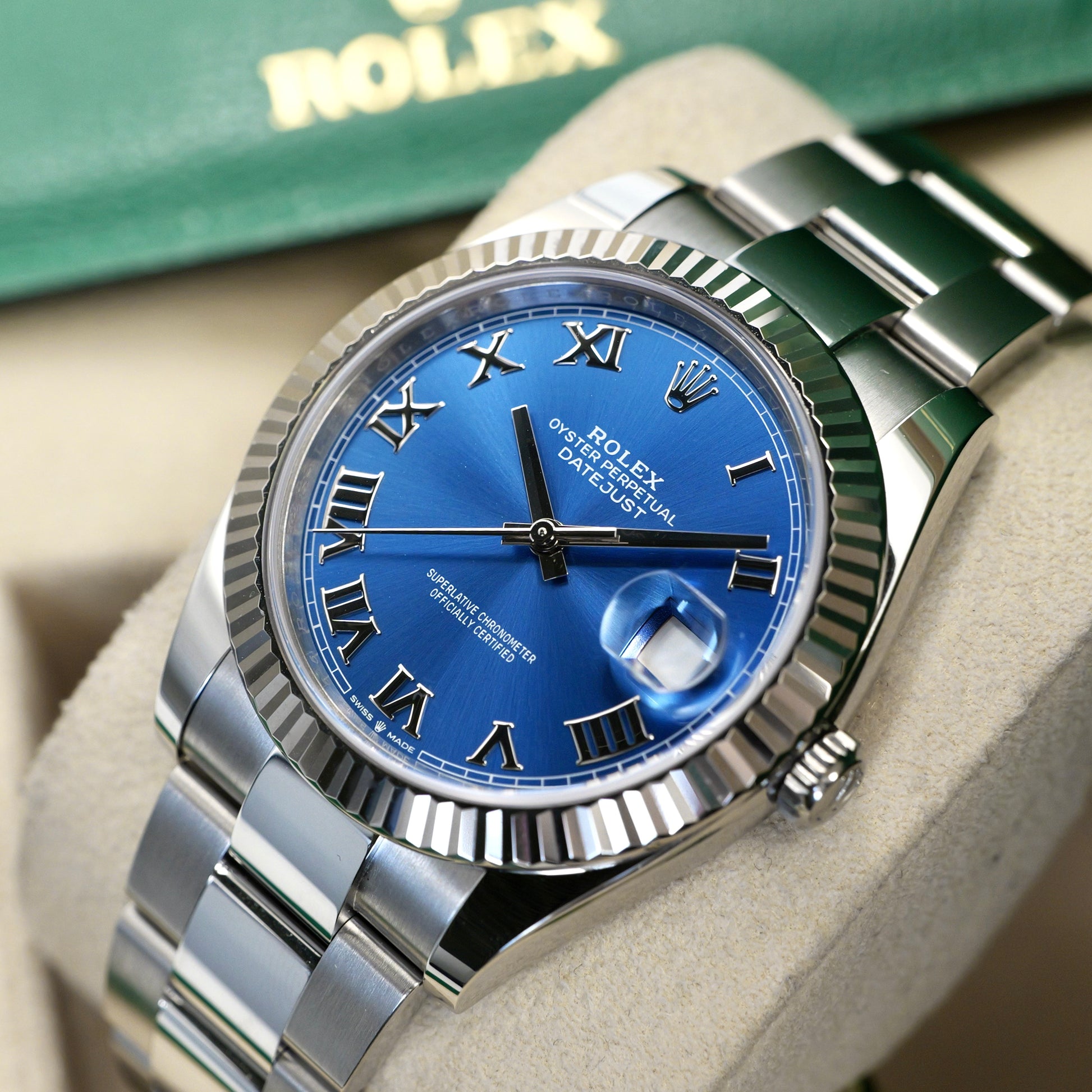 The Rolex Datejust 41 126334 in Oystersteel and 18k white gold, featuring the sought-after Azzurro blue Roman dial, blends timeless elegance with striking detail. Its 41mm Oyster case, framed by the iconic fluted bezel, captures light with every movement—refined yet dynamic.