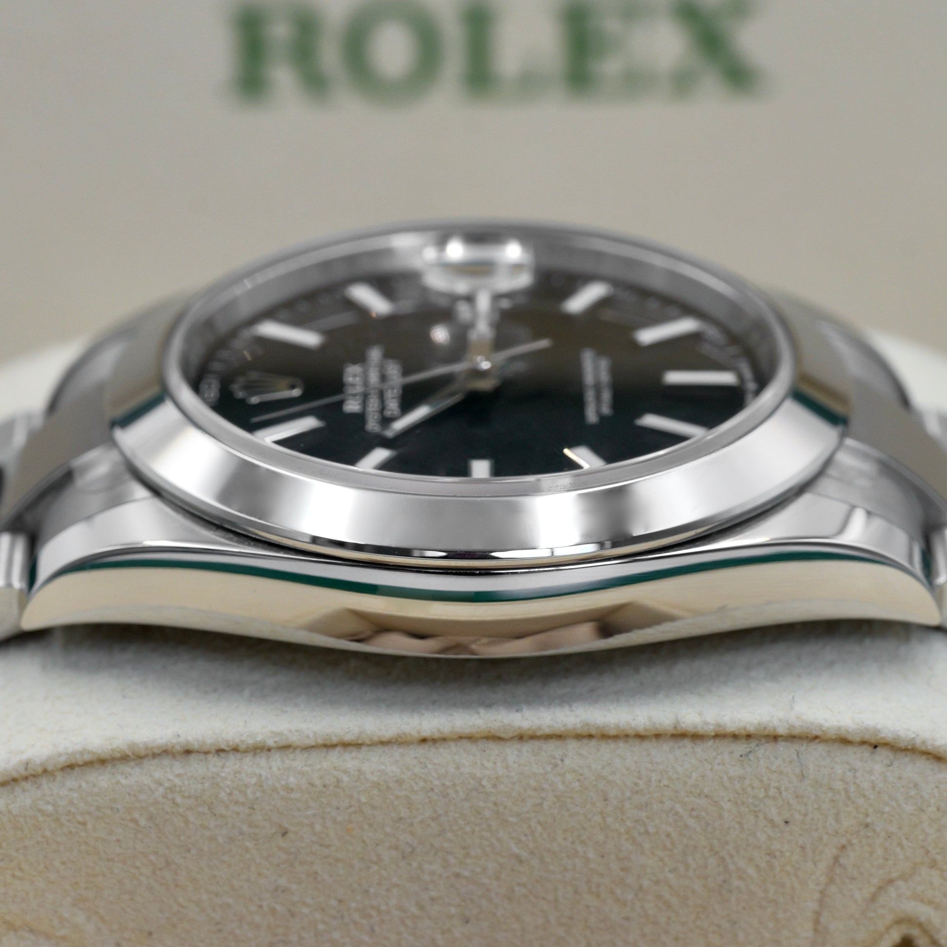 The sunray-finished black dial is accented by applied white gold hour markers and the iconic Cyclops lens over the date window, ensuring clarity and precision with every glance. Worn on the streamlined Oyster bracelet, the 126300 is bold in form, timeless in style, and unmistakably Rolex.