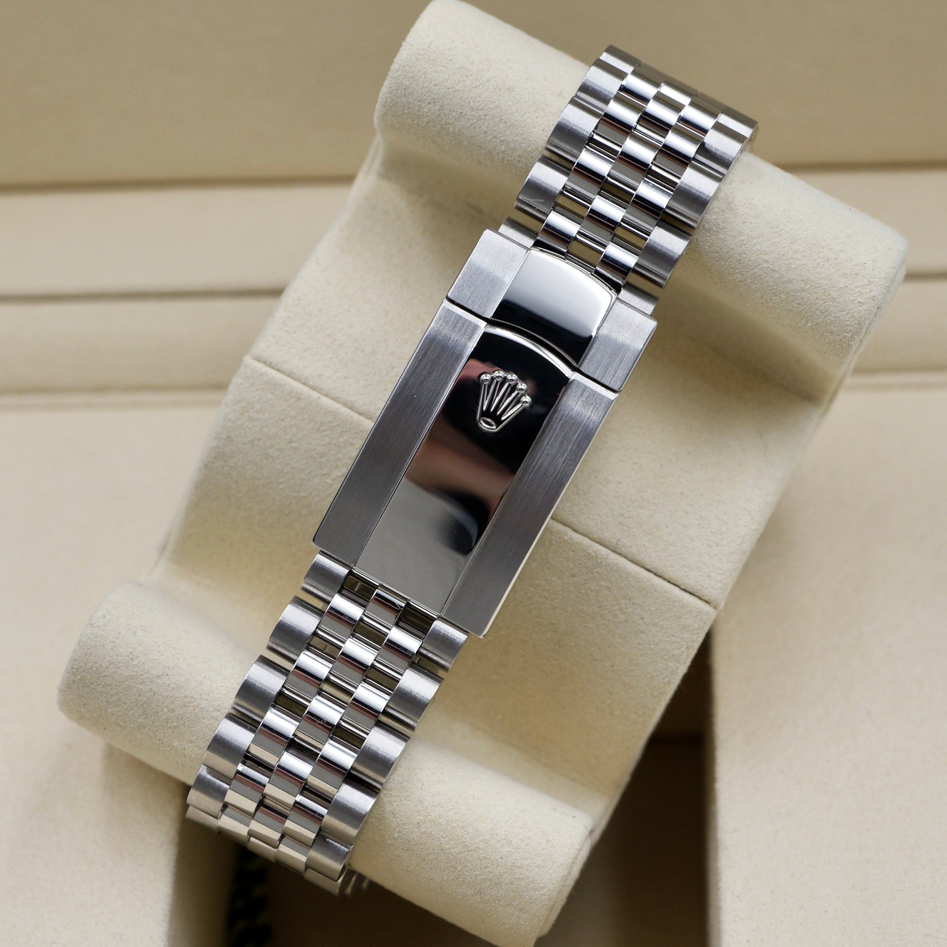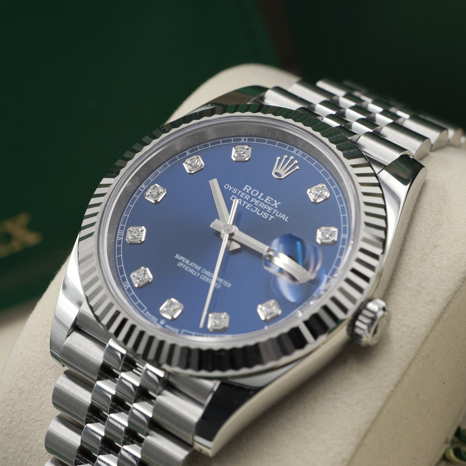 The 41 mm Oyster case is topped with Rolex’s signature fluted bezel in solid white gold, shimmering with every movement and framing the vivid blue dial beautifully. The dial’s sunray finish offers incredible depth, shifting tones as it catches the light. Each hour is marked by brilliant-cut diamonds set in 18 ct white gold settings, while polished hands and the date display at 3 o’clock magnified by the Cyclops lens complete the elegant design.