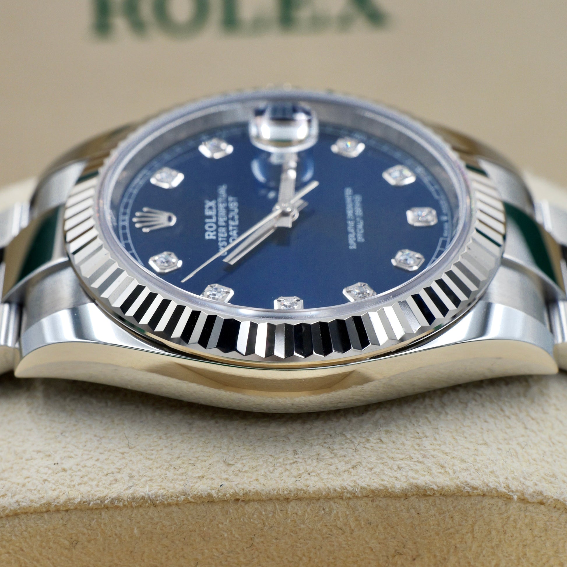 The Rolex Datejust 41 with a blue diamond dial is an exquisite expression of timeless elegance. Its 41mm Oystersteel case, paired with a fluted or smooth bezel, offers a refined and versatile profile, perfect for any occasion.