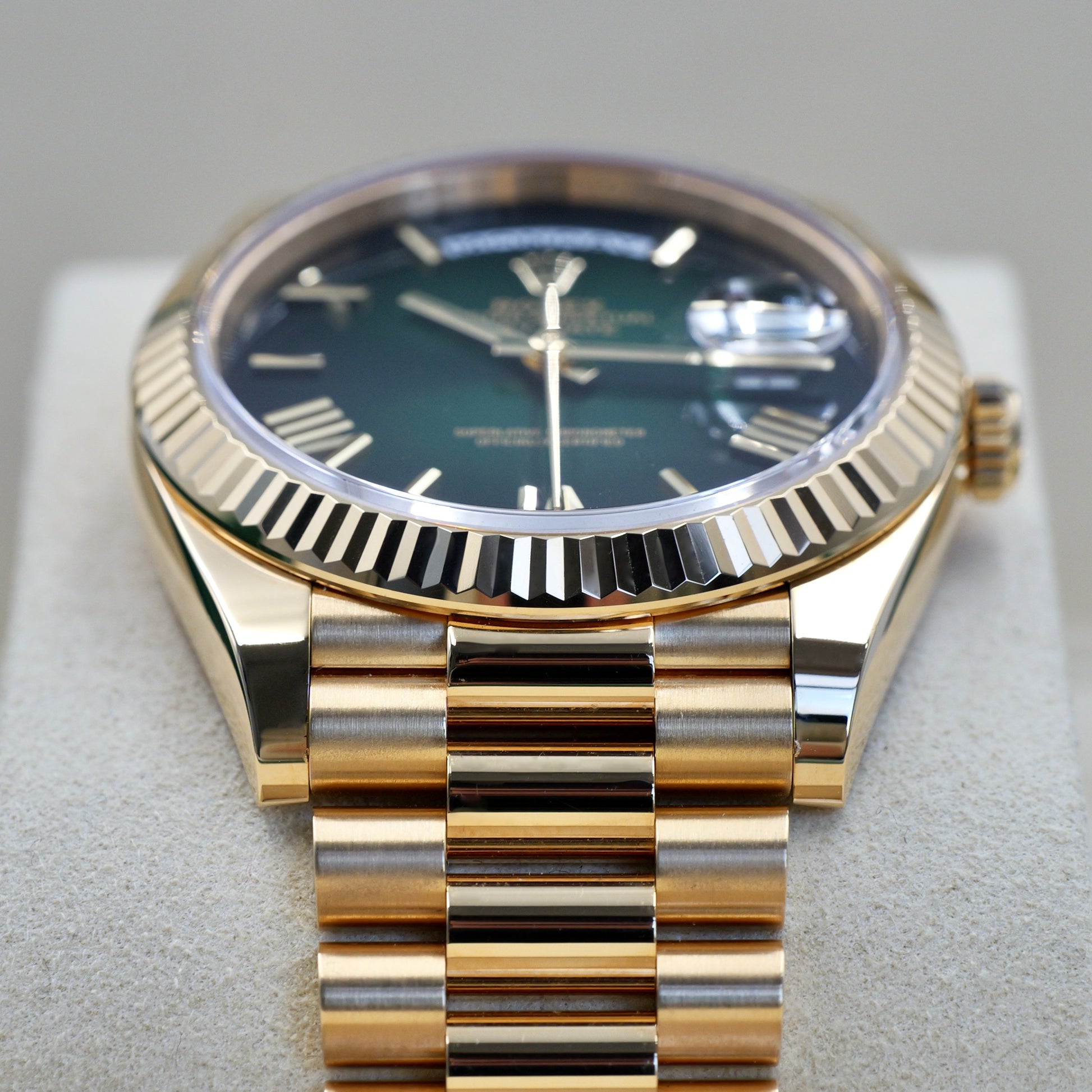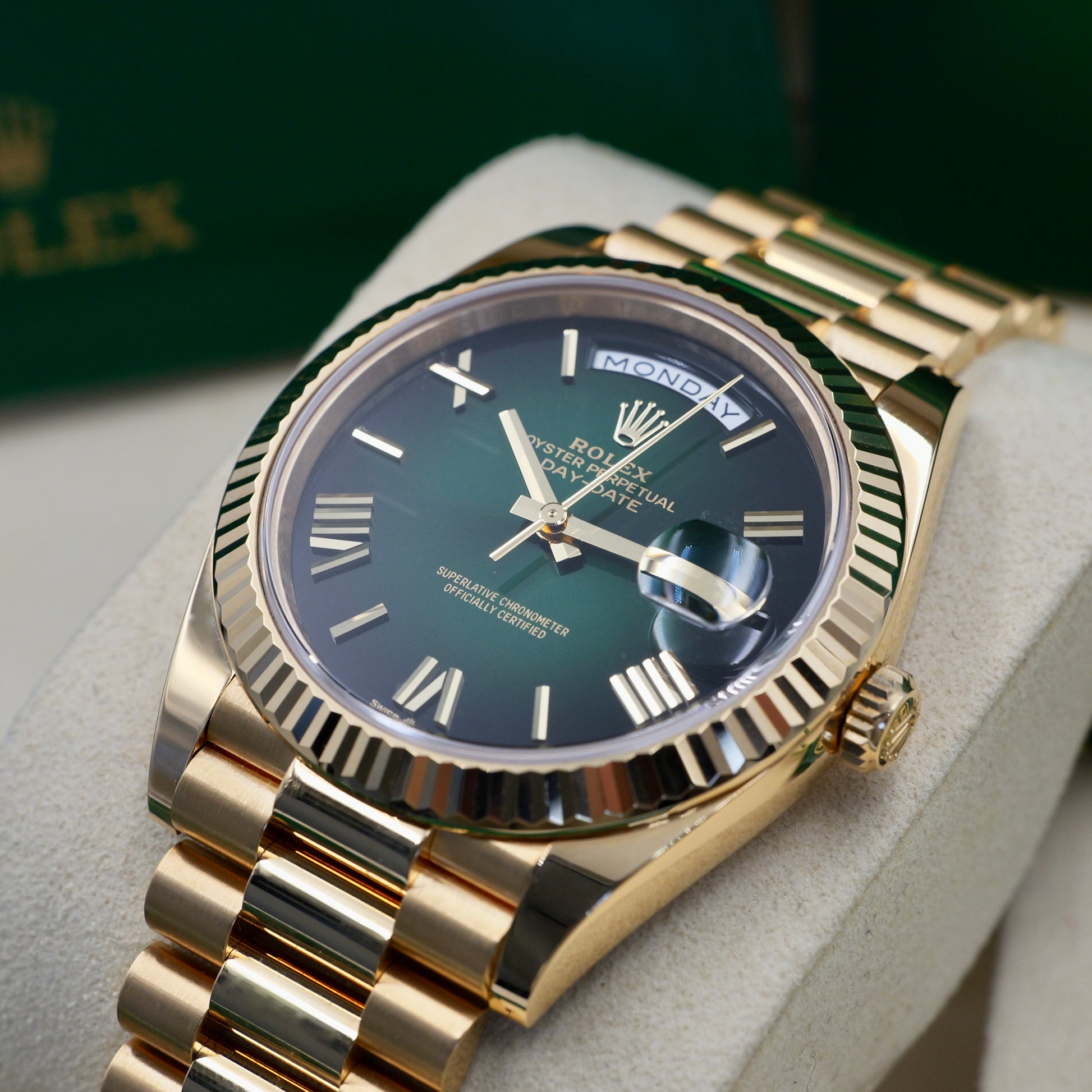 Rolex Day-Date 40 Ombré Green Yellow Gold 228238 - Full Set (2025)