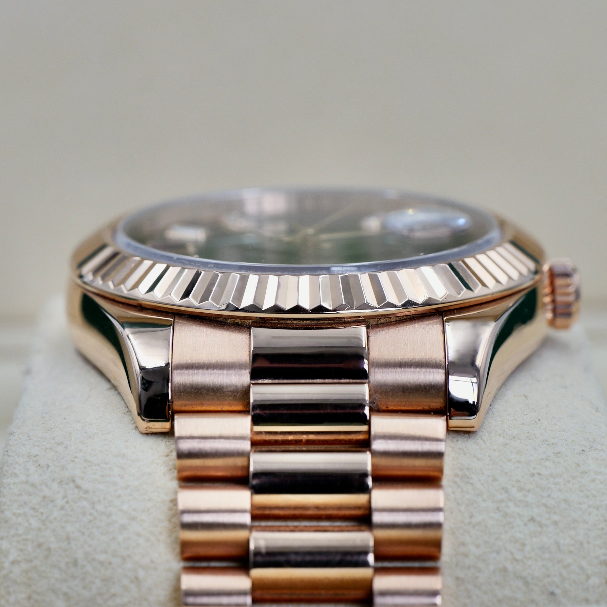 The deep, rich dial is adorned with factory-set baguette ruby hour markers, contrasting beautifully against the lustrous backdrop and framed by the refined fluted bezel. With its signature day and date apertures and the unmistakable President bracelet, this Day-Date is bold in presence, regal in design, and unquestionably one of Rolex’s most exclusive statements.