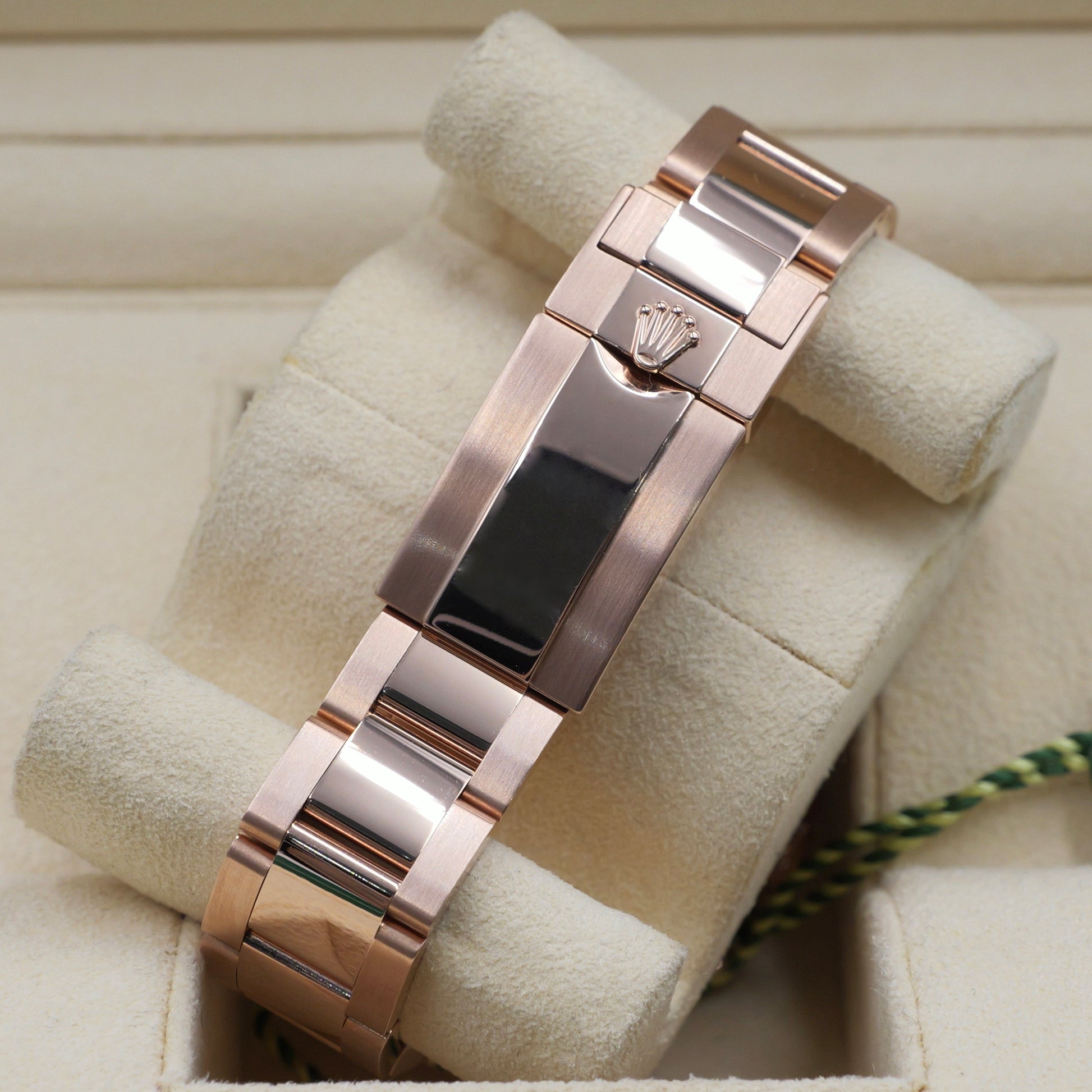 The 40 mm Oyster case, crafted from Rolex’s proprietary Everose gold, is paired with a fixed tachymeter bezel for precise speed measurements a nod to the Daytona’s racing heritage. Three sub-dials in matching Everose accents provide perfect chronograph readability, while Chromalight-filled markers ensure visibility in all conditions.