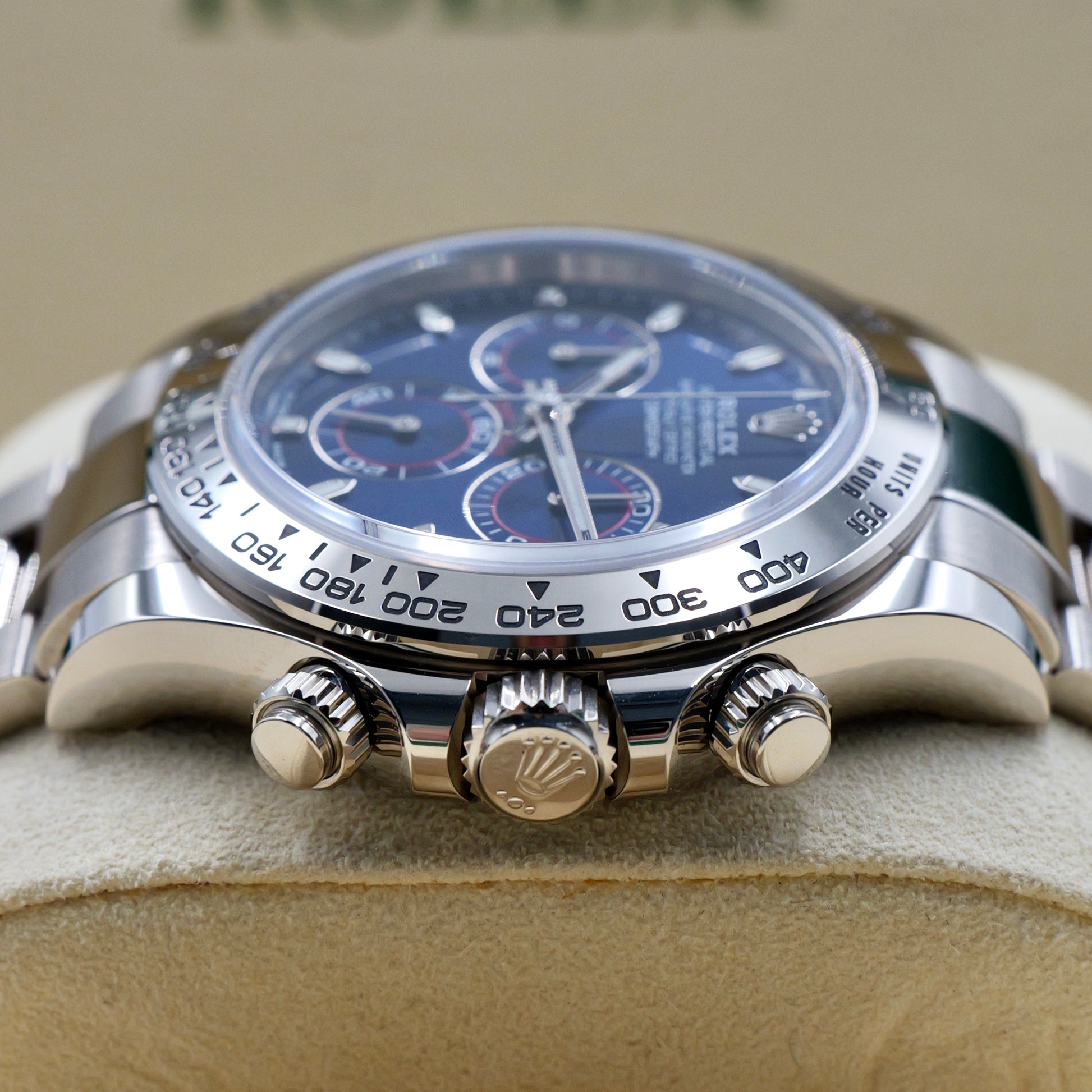 The Rolex Cosmograph Daytona reference 116509 brings together the unrivalled racing pedigree of the Daytona with the refined allure of 18 ct white gold and a striking blue dial. This iteration is a standout in the Daytona lineage, offering a beautiful balance of luxury, performance, and everyday wearability.