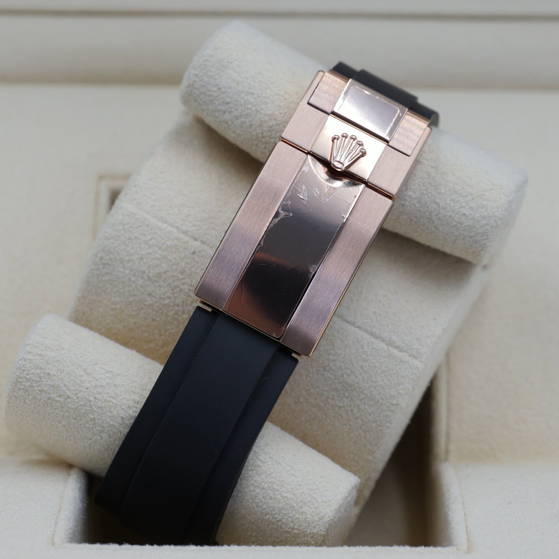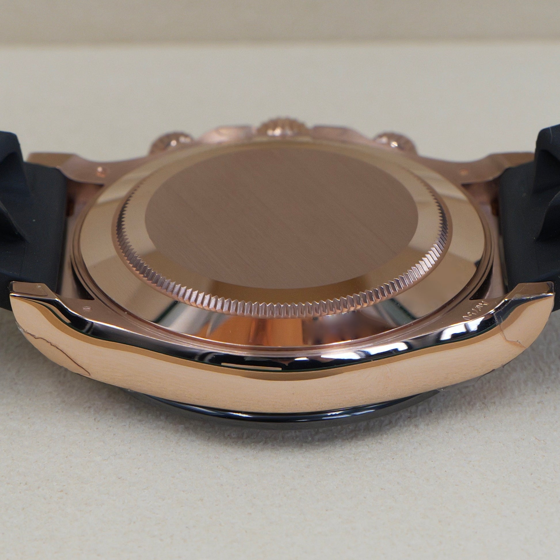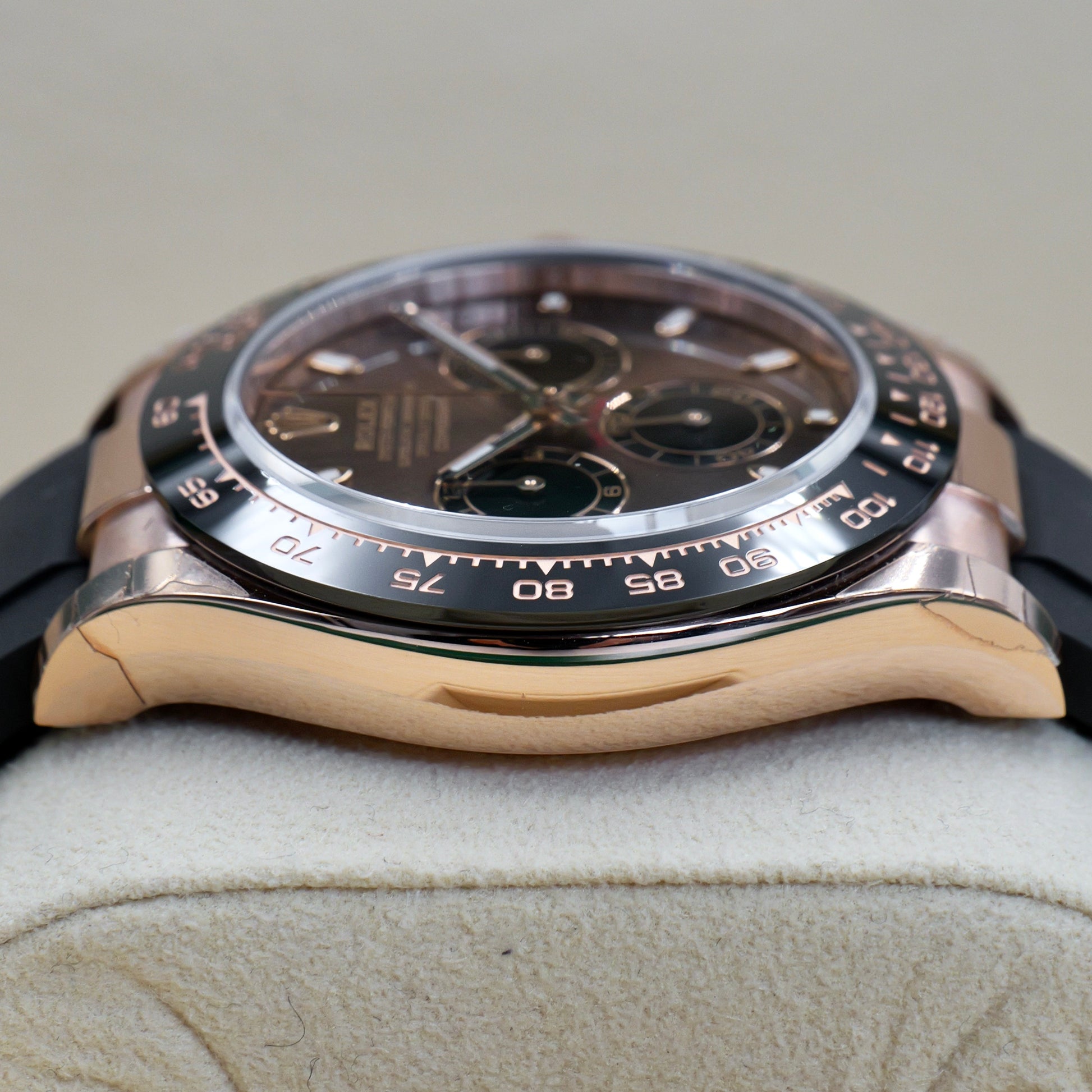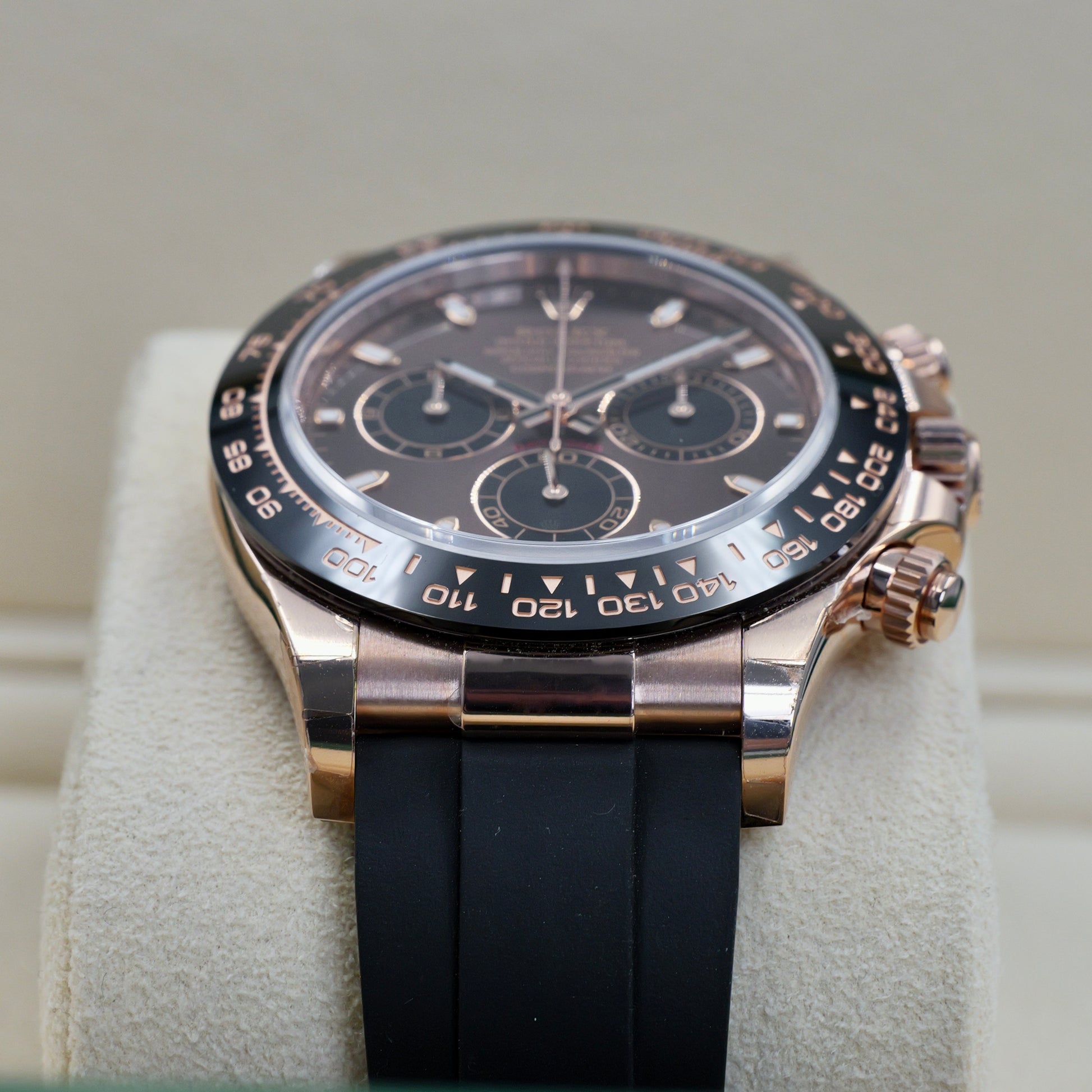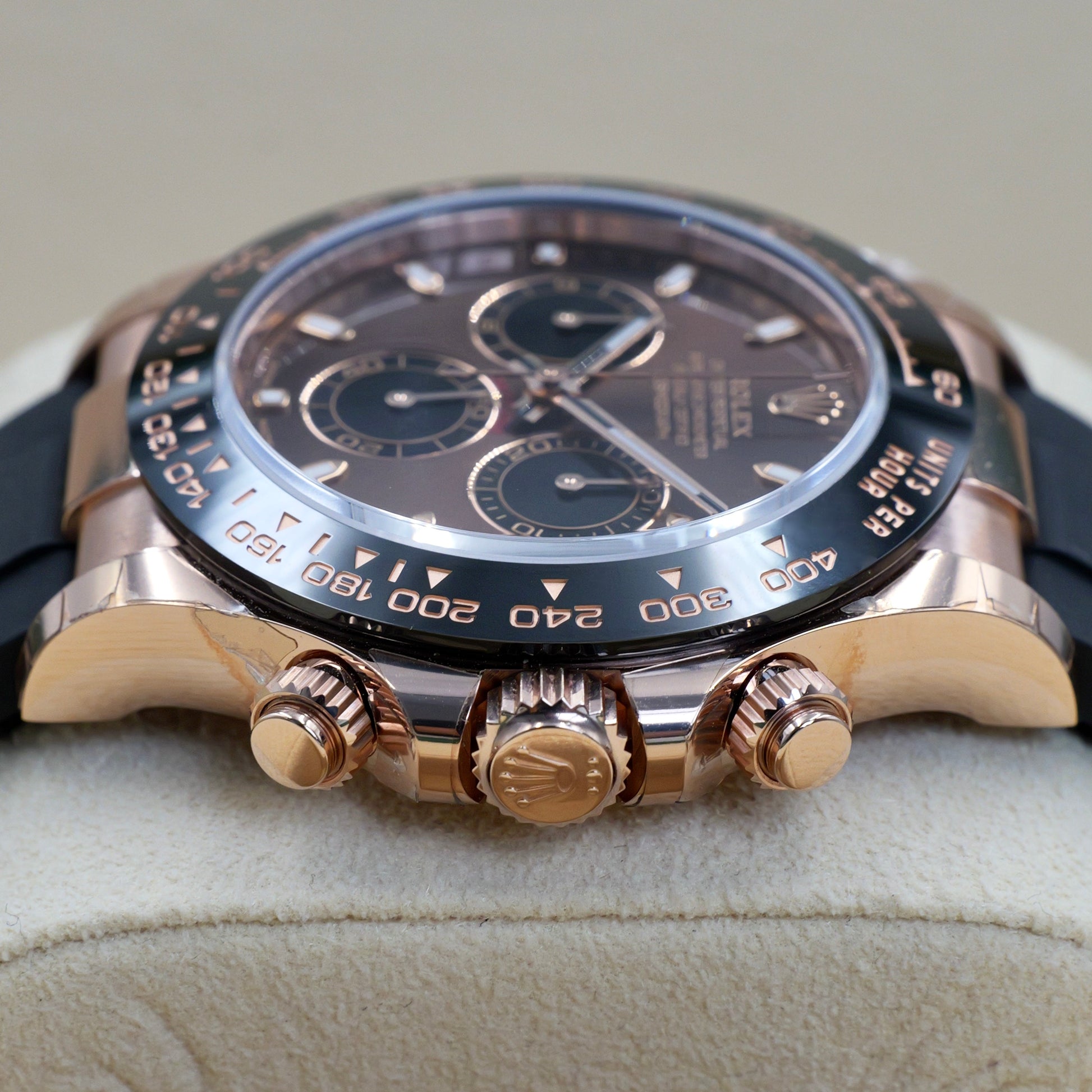 The 40 mm Oyster case, crafted from Rolex’s proprietary Everose gold, is paired with a black Cerachrom tachymeter bezel—scratch-resistant, corrosion-proof, and designed for precision speed measurement. The chocolate dial, accented by contrasting black sub-dials, radiates sophistication while enhancing chronograph readability. Applied Everose gold hour markers and hands filled with Chromalight ensure exceptional legibility in any light.