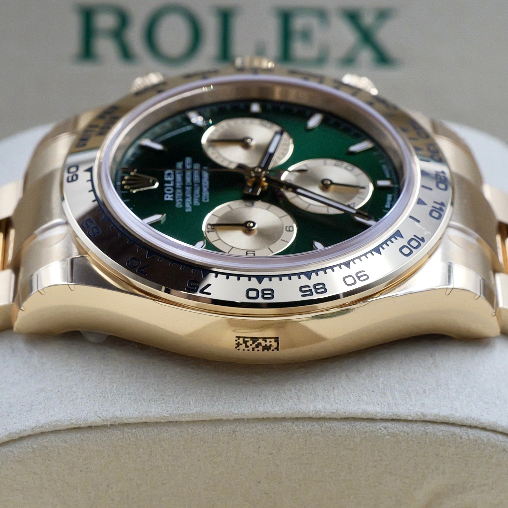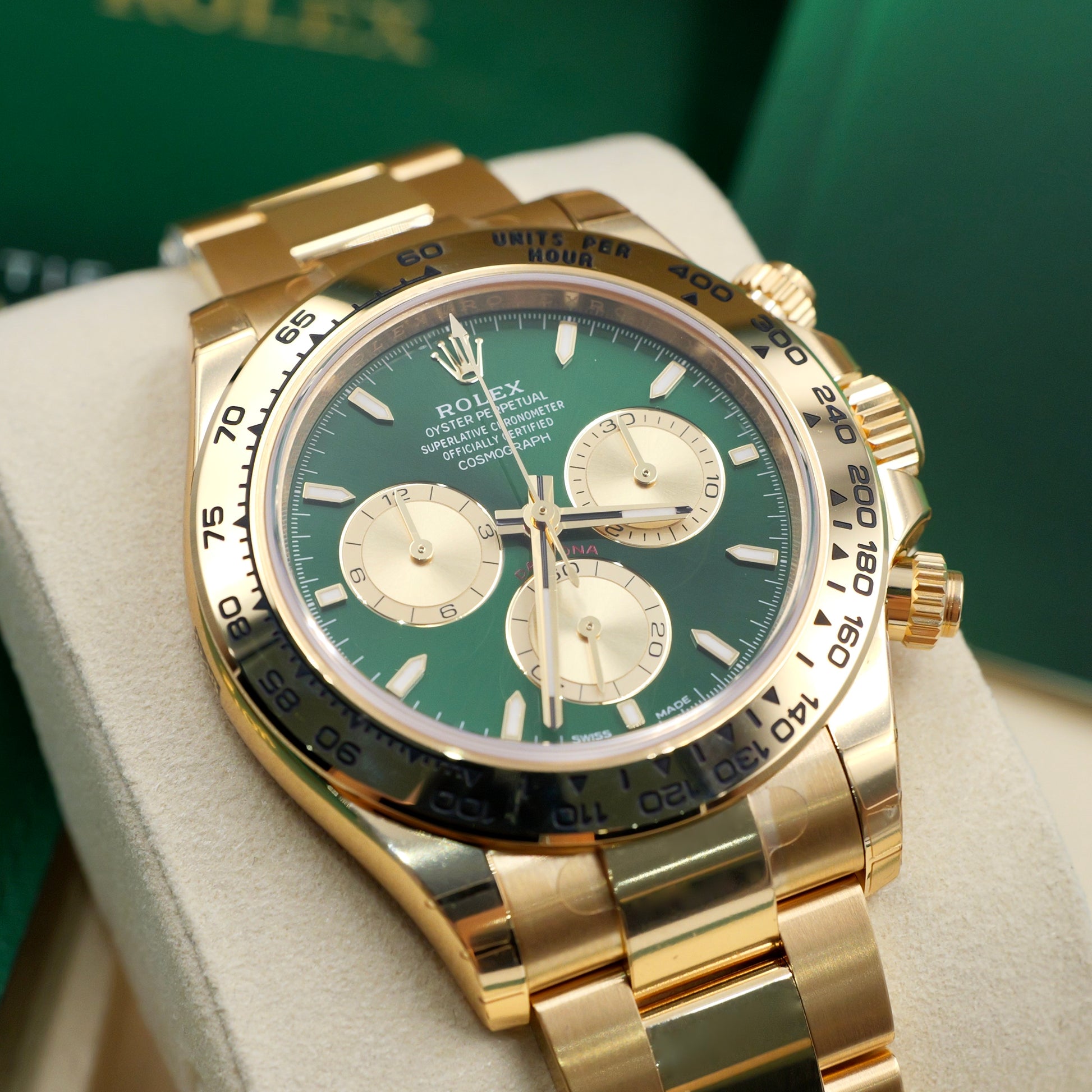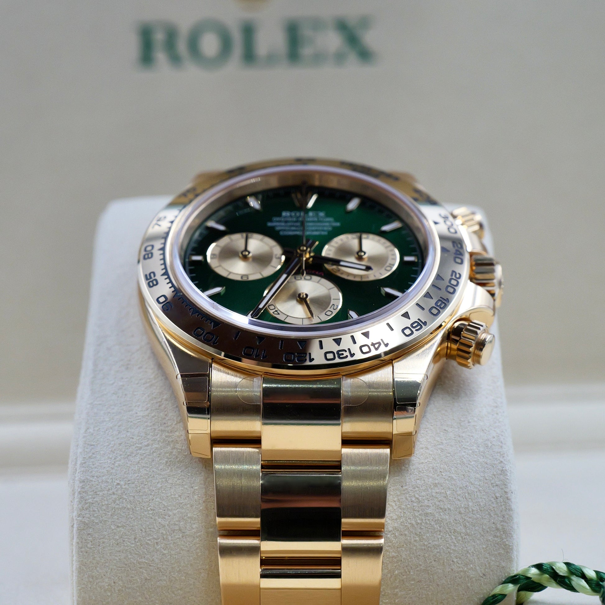 The luminous green dial, paired with gold subdials and red Daytona script, creates a contrast that’s both bold and refined. Framed by the tachymeter-engraved gold bezel, this reference remains true to its racing roots while pushing the boundaries of aesthetic luxury.