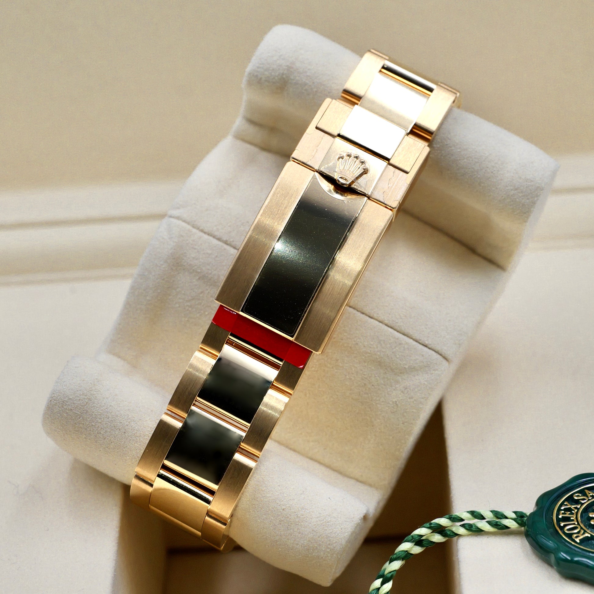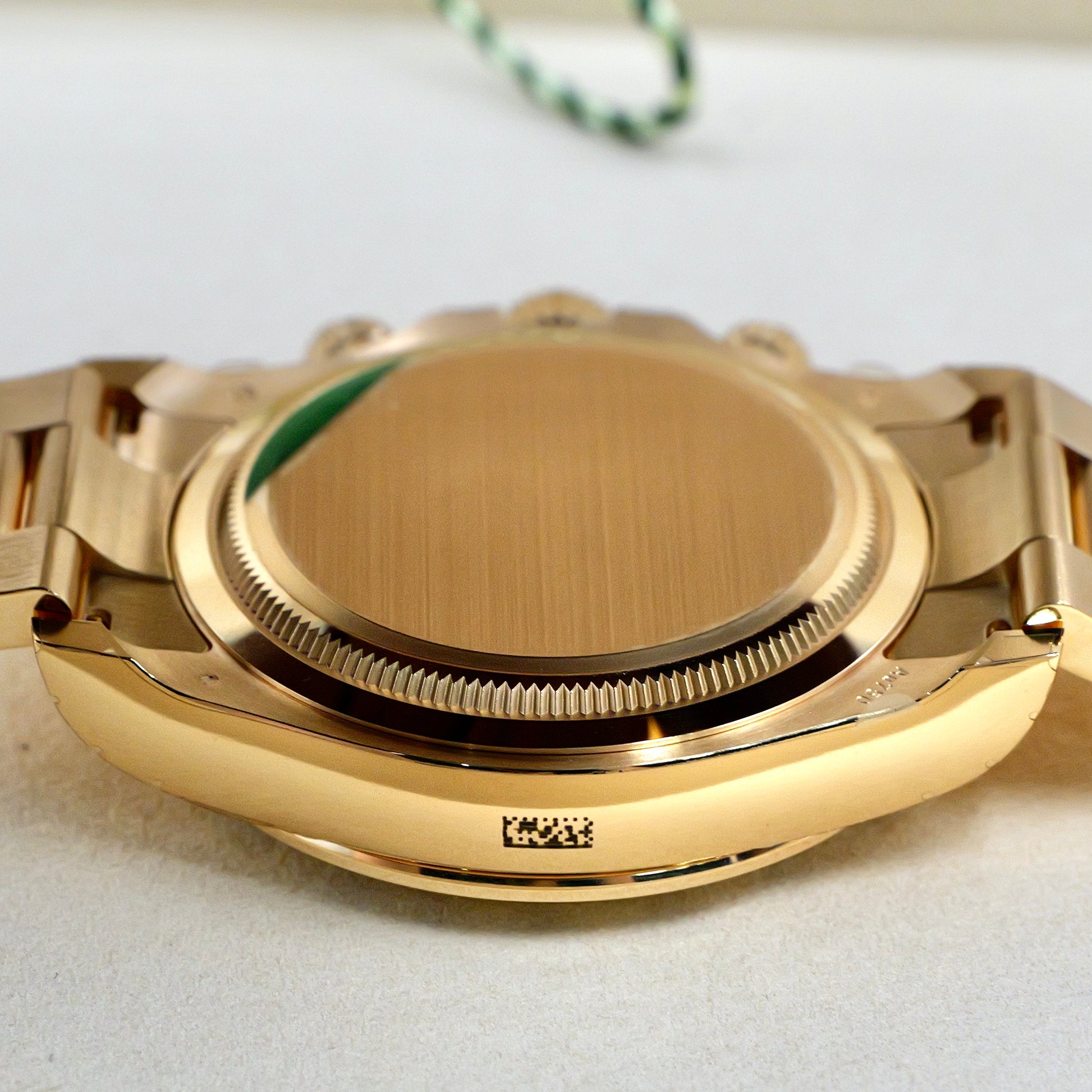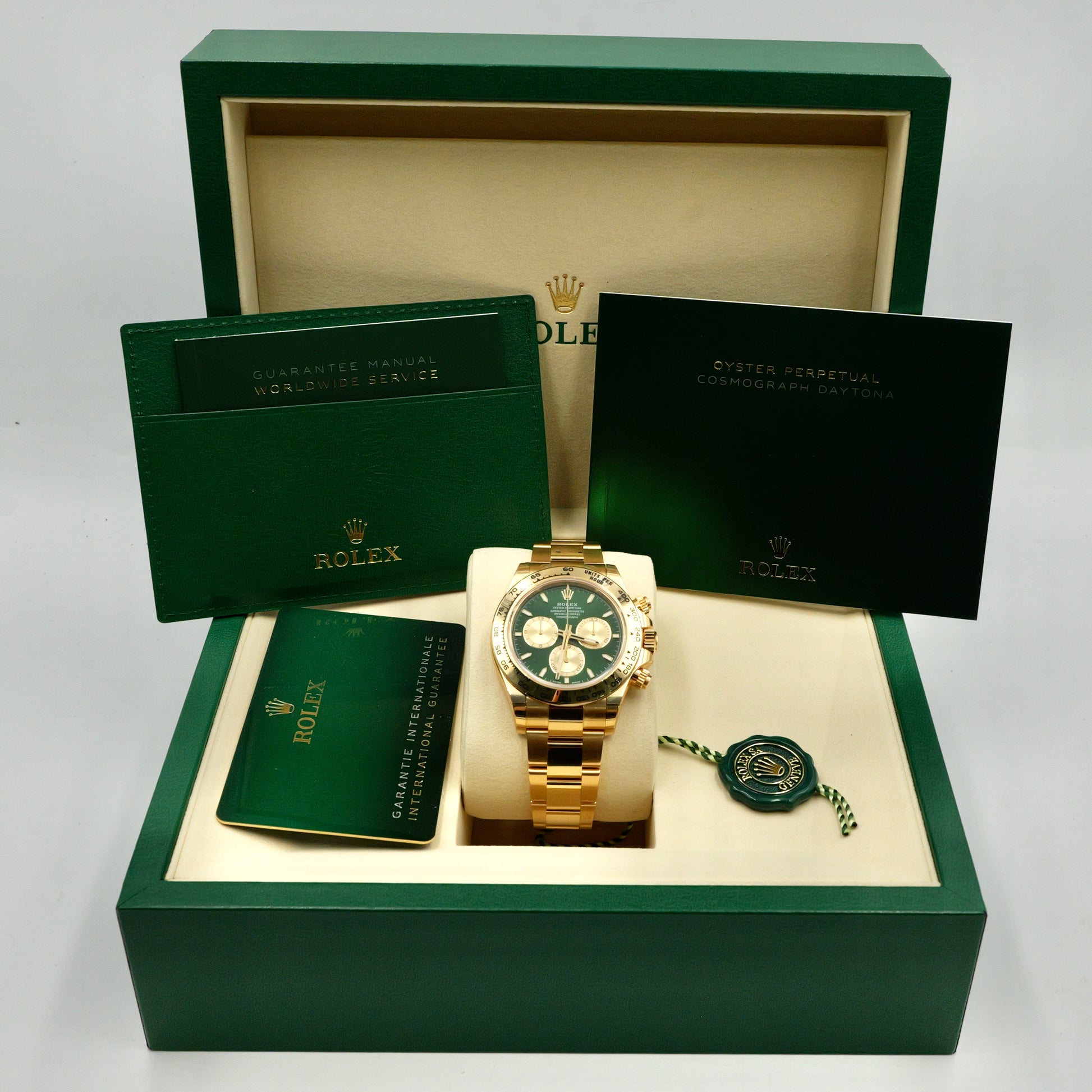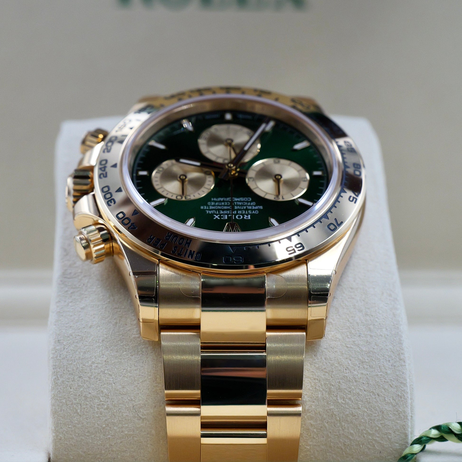 The luminous green dial, paired with gold subdials and red Daytona script, creates a contrast that’s both bold and refined. Framed by the tachymeter-engraved gold bezel, this reference remains true to its racing roots while pushing the boundaries of aesthetic luxury.