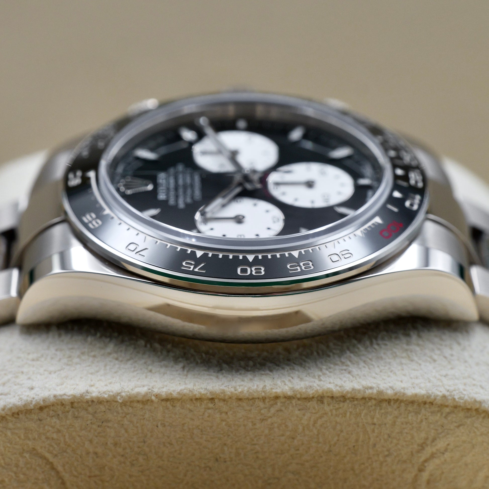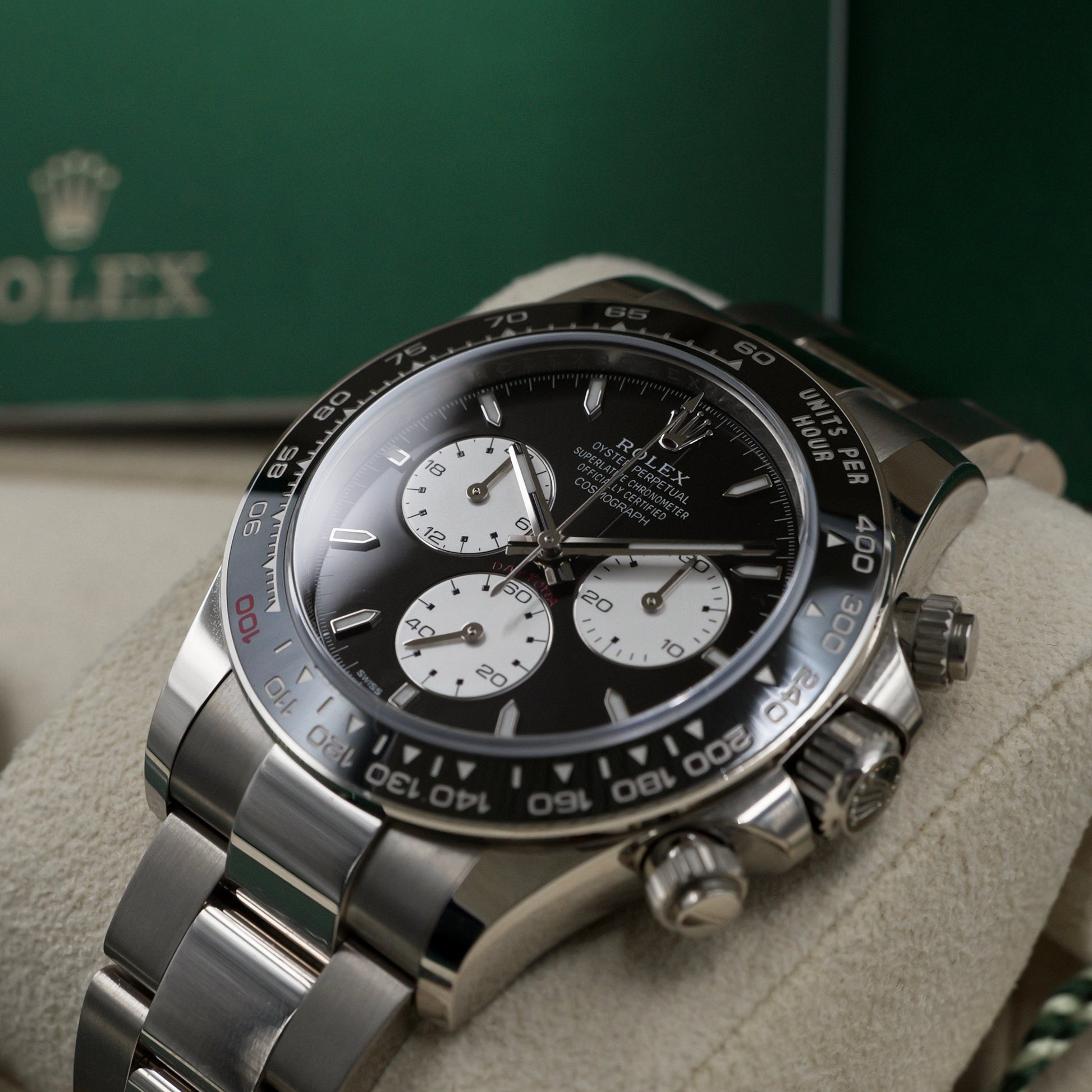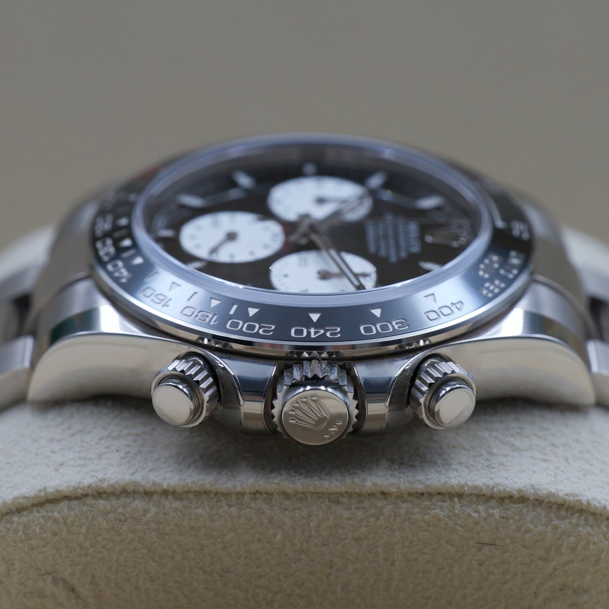 The 40 mm Oyster case, rendered in lustrous white gold, delivers refined weight and presence while maintaining the unmistakable Daytona profile. It is paired with a black Cerachrom bezel