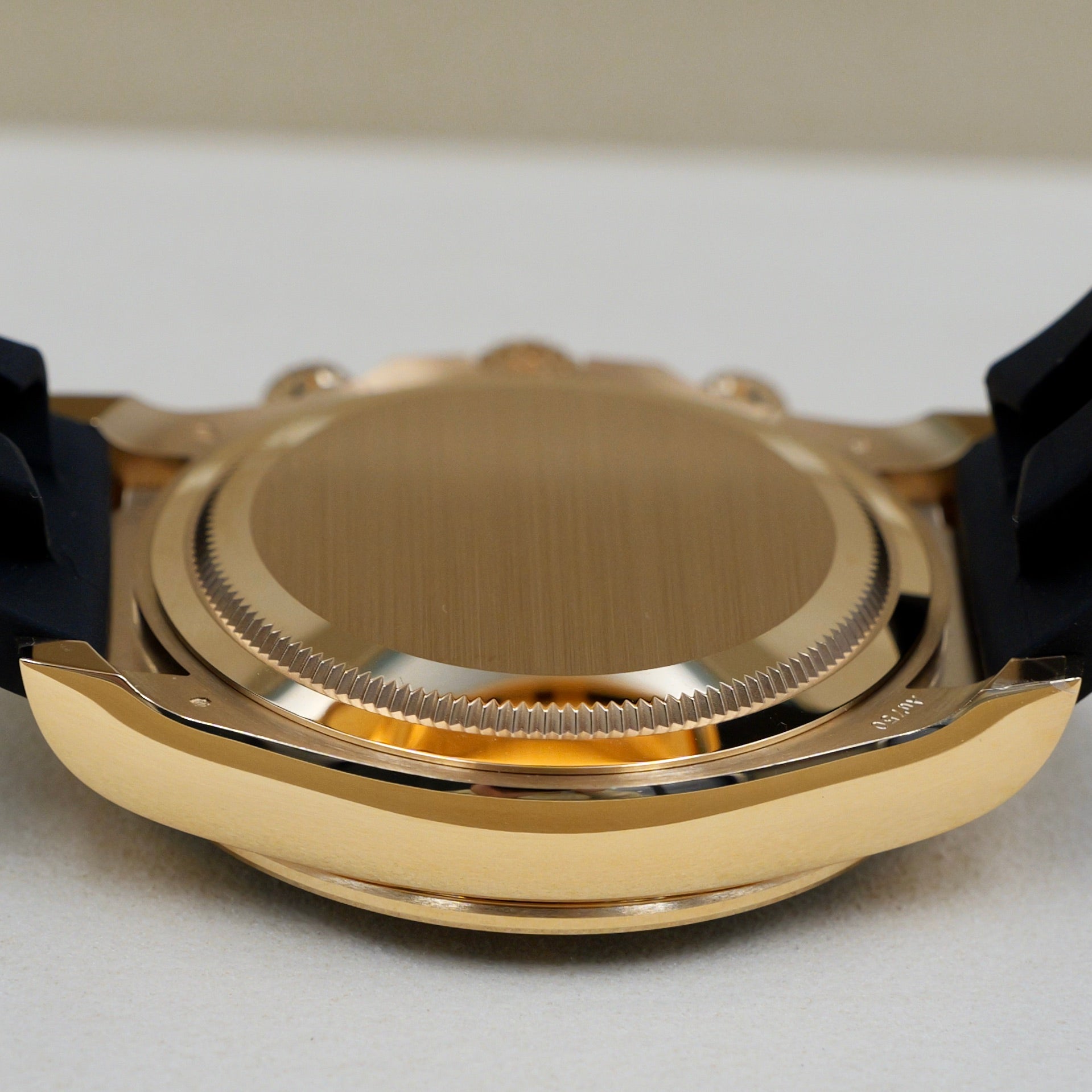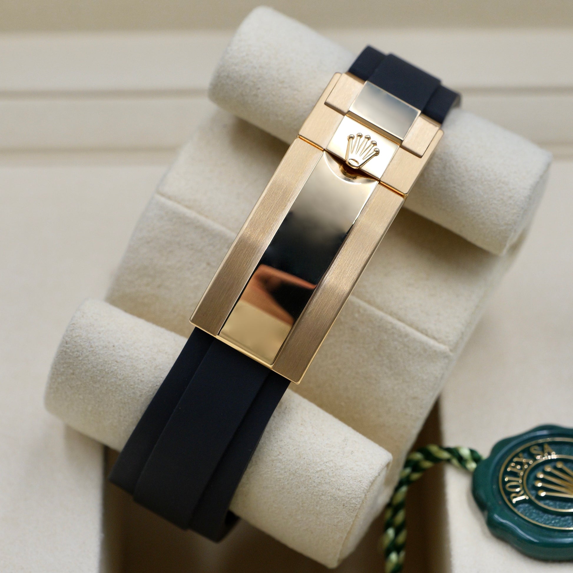 The 40 mm Oyster case is crafted from Rolex’s proprietary yellow gold and finished with a black Cerachrom bezel engraved with a tachymetric scale an unmistakable Daytona signature that provides both function and dramatic contrast. The vivid turquoise lacquer dial instantly commands attention, offering a bold yet refined aesthetic.