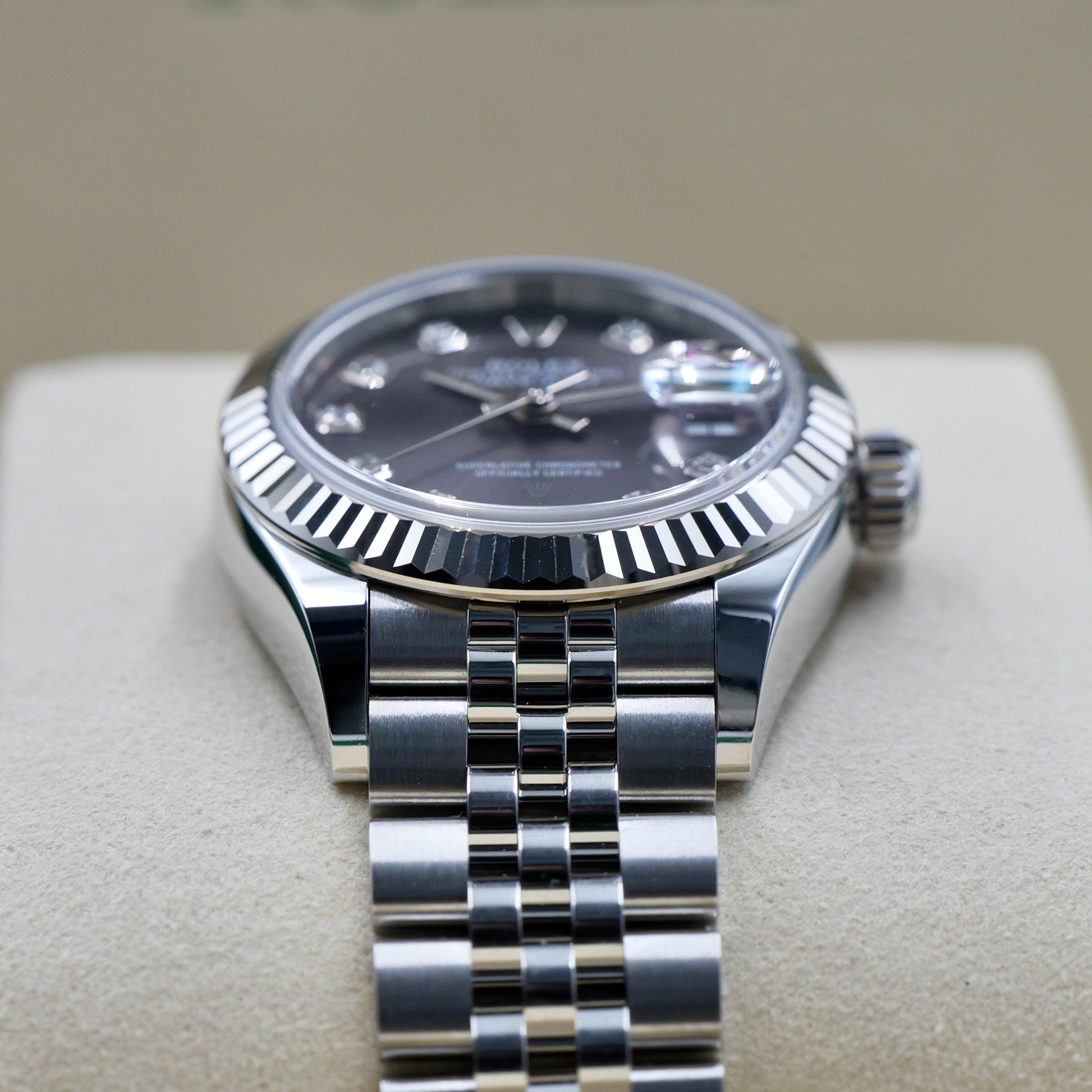 The Rolex Lady-Datejust 28 reference 279174 is a refined expression of timeless sophistication, pairing classic Rolex design with the subtle radiance of a rhodium diamond-set dial. Crafted from Oystersteel and crowned with an 18 ct white-gold fluted bezel, this configuration delivers graceful proportions and enduring luxury in a perfectly balanced 28 mm case.