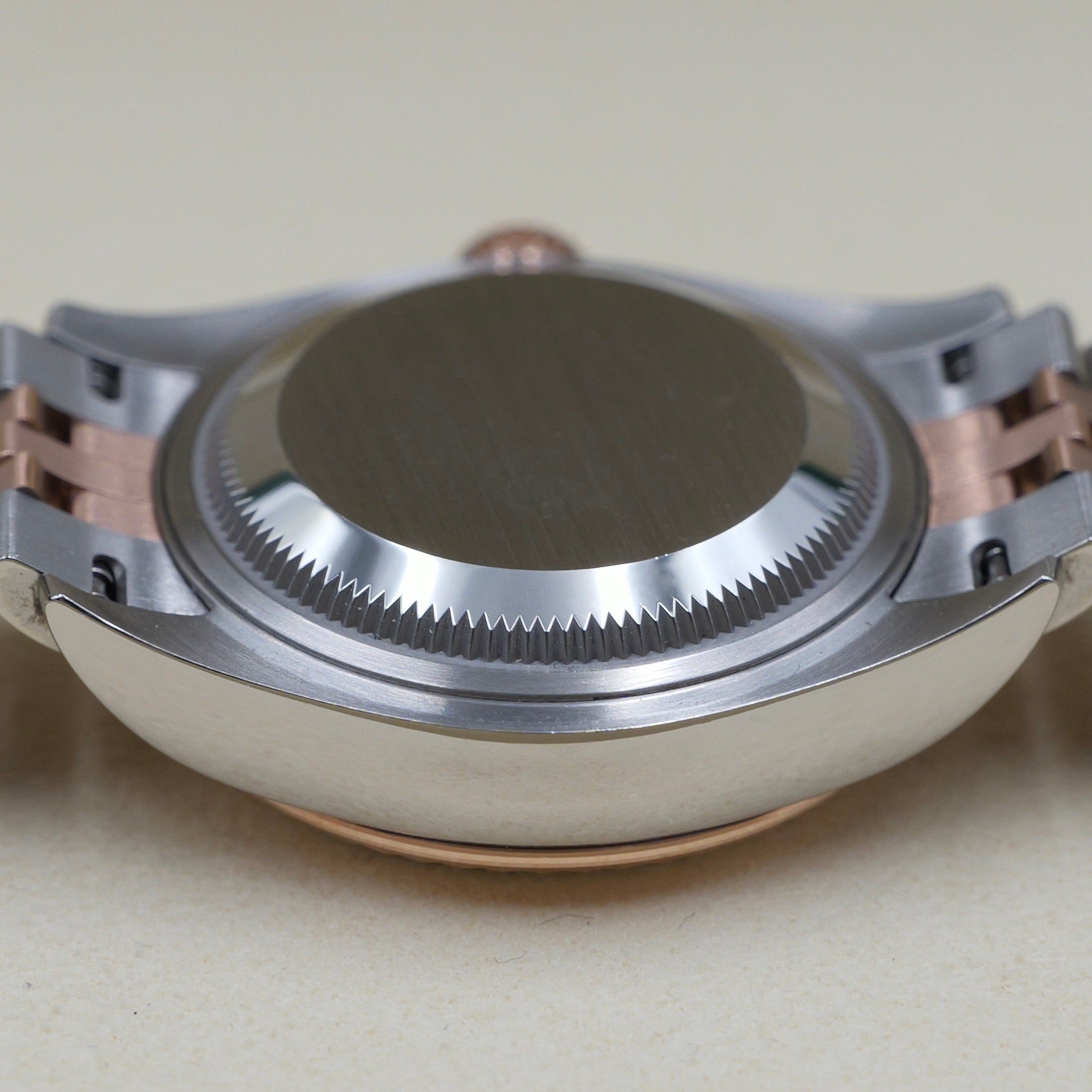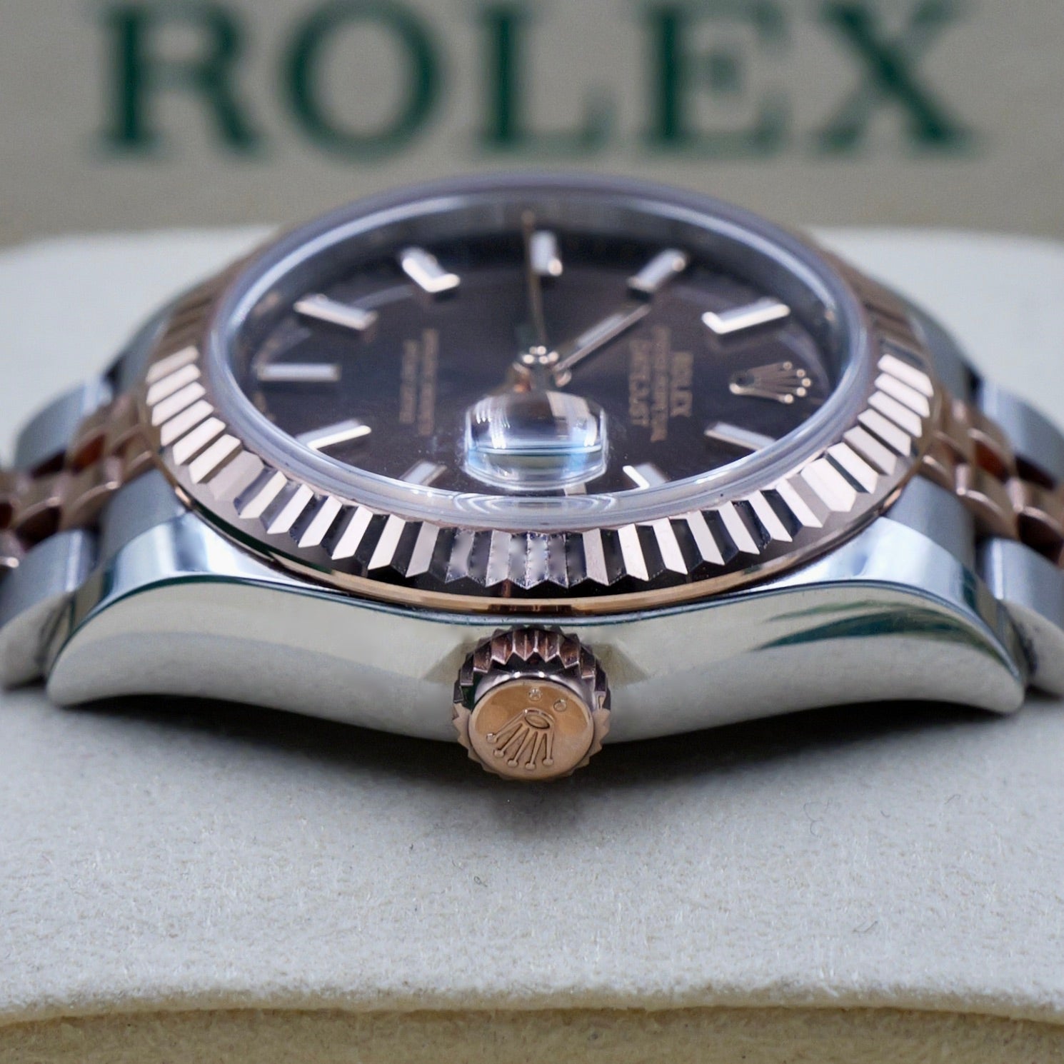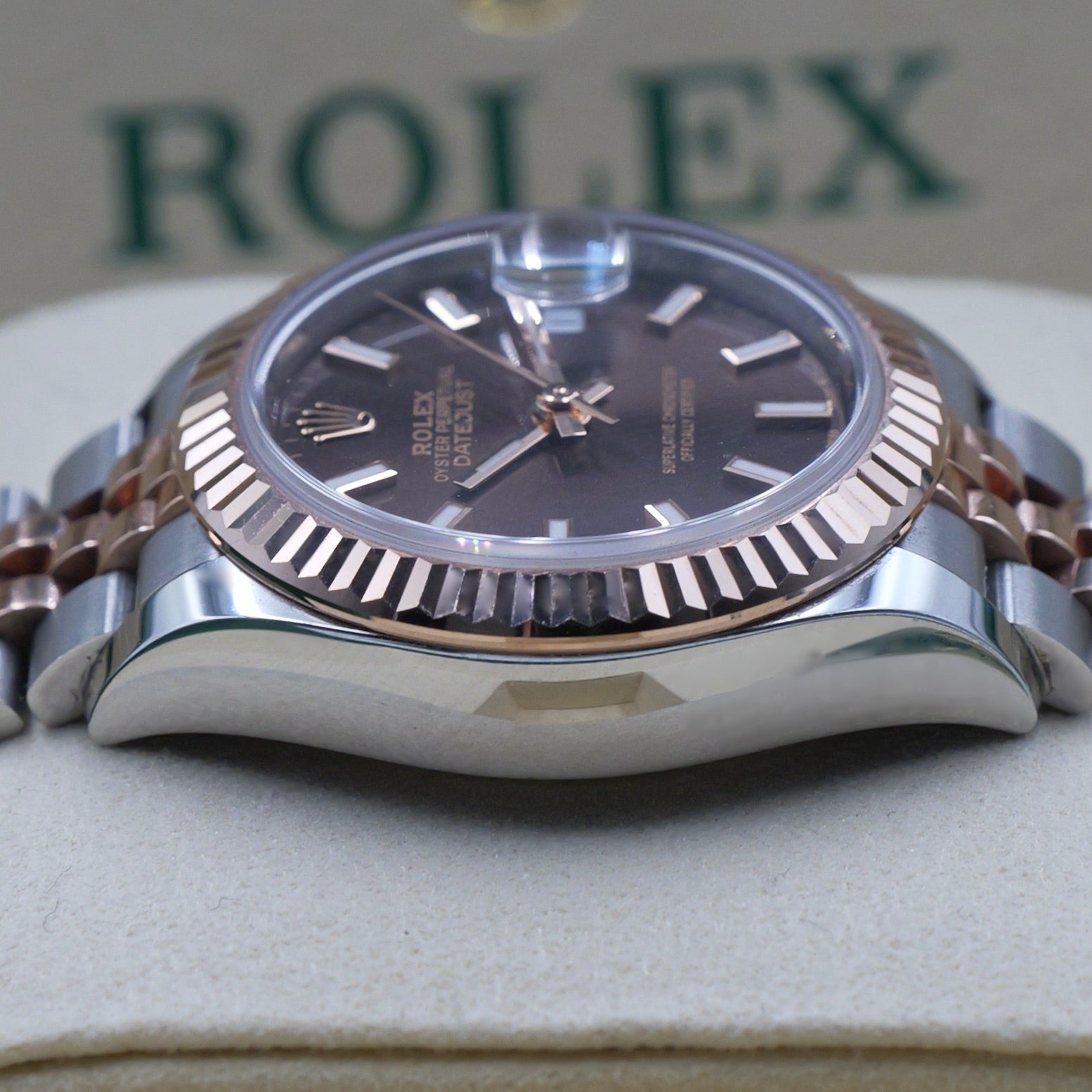 The Rolex Lady-Datejust 28 reference 279171 is a beautifully balanced timepiece that combines classic Rolex design with rich, contemporary warmth. Crafted in Everose Rolesor Rolex’s exclusive blend of Oystersteel and 18 ct Everose gold this configuration is elevated by a luxurious chocolate sunray dial and the iconic Jubilee bracelet, creating a watch that is both timeless and effortlessly elegant.