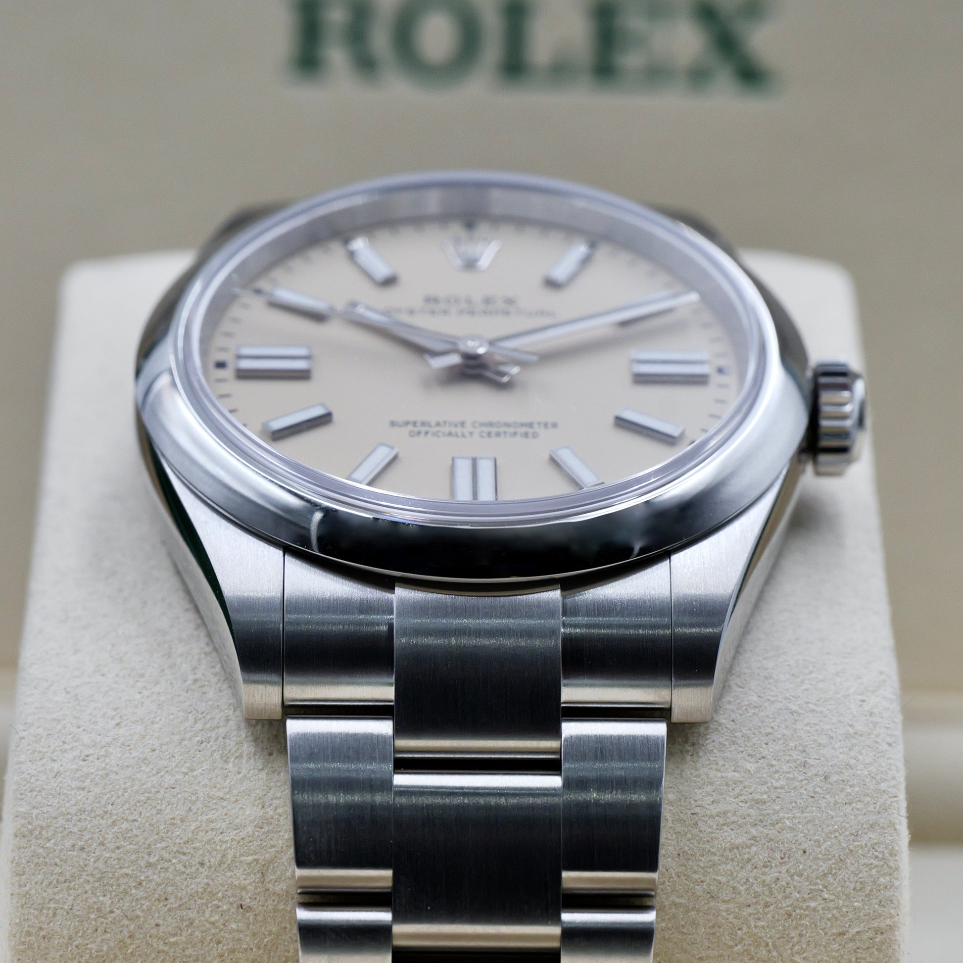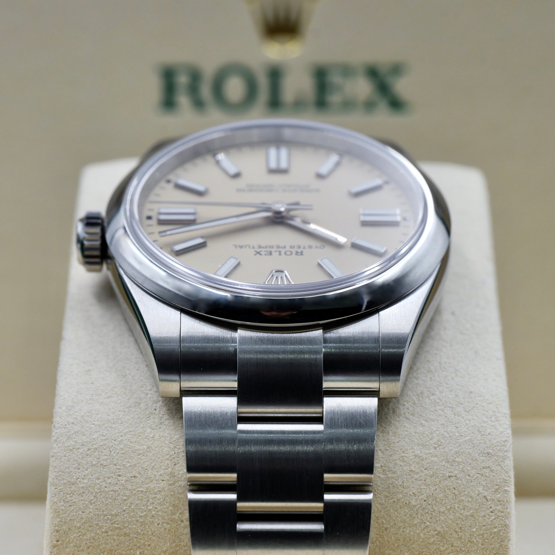 The Beige dial, enhanced by a sunburst finish, radiates depth and sophistication, while luminous white gold hour markers ensure impeccable readability. Paired with the iconic Oyster bracelet, this timepiece is the perfect fusion of minimalist design and Rolex’s signature precision a true modern classic.