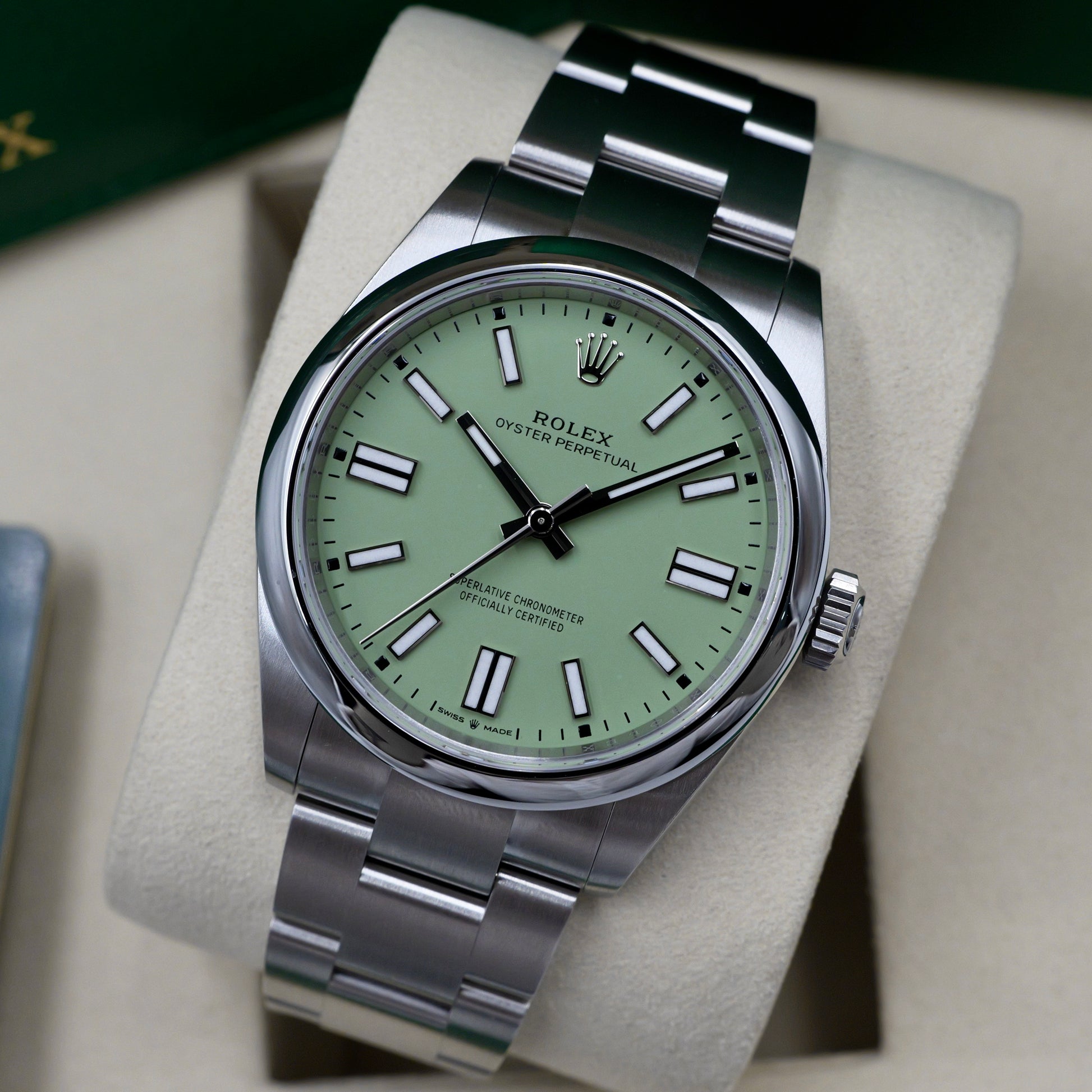 The Rolex Oyster Perpetual 41 ref. 124300 with the sought-after pistachio green dial blends timeless Rolex design with a vibrant, modern spirit. Its 41mm Oystersteel case is crafted for daily versatility, featuring clean lines, brushed surfaces, and polished accents that highlight the simplicity of the silhouette.