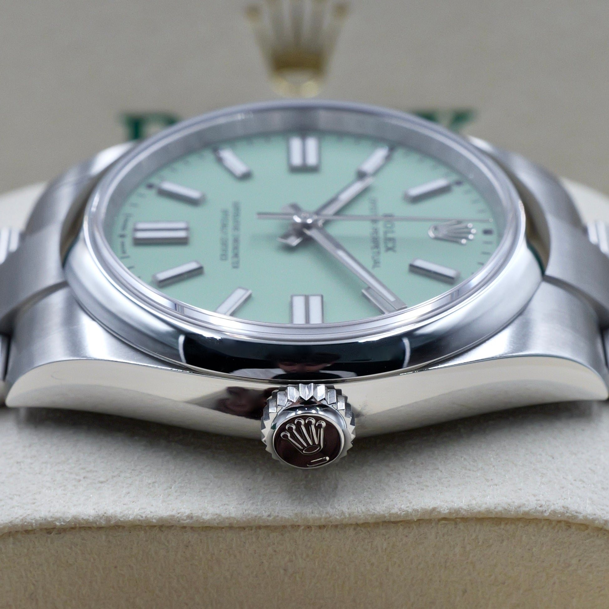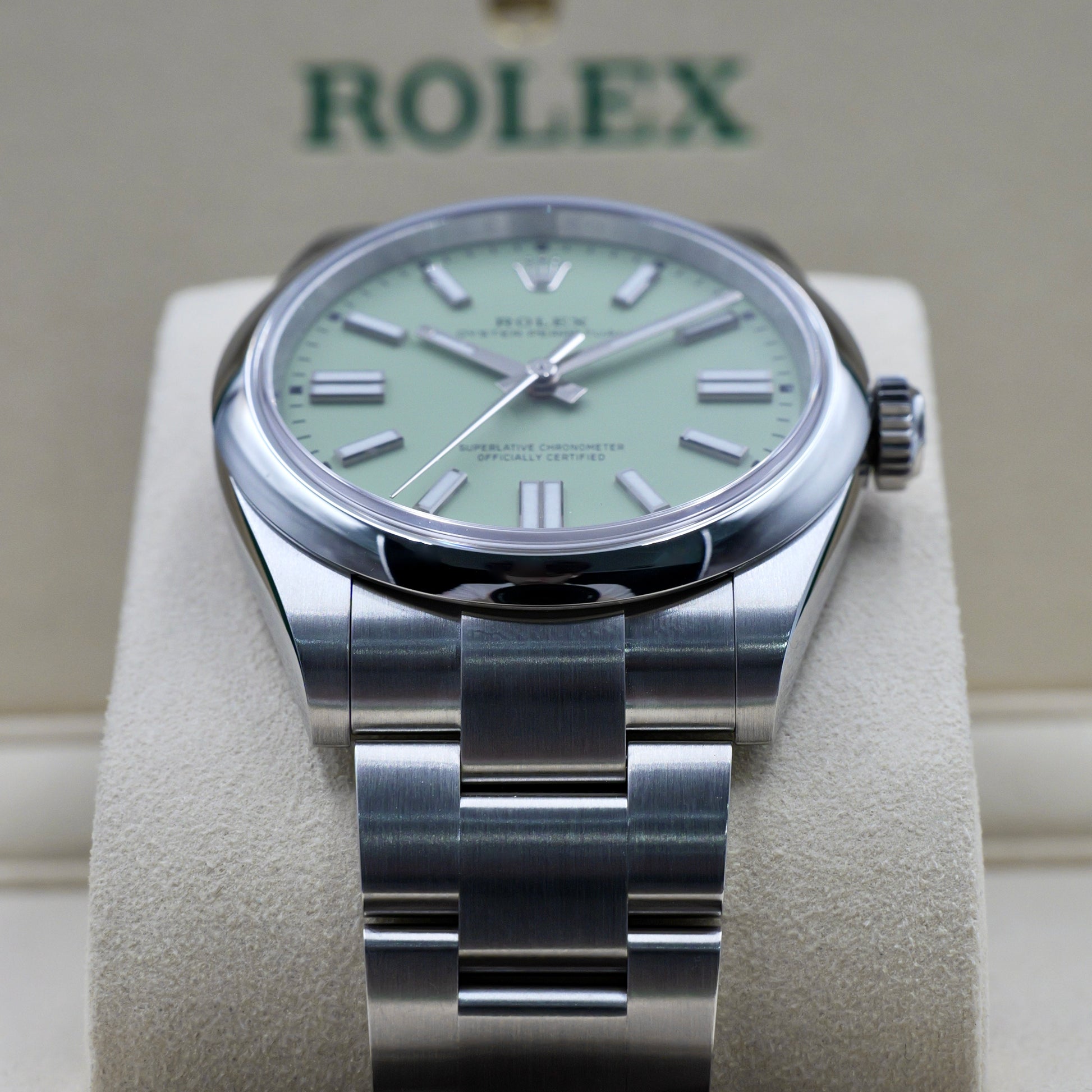 The pistachio sunray dial is both playful and elegant, catching the light with a dynamic shimmer. Its Chromalight hour markers and hands ensure exceptional legibility while staying true to the model’s understated aesthetic. Powered by the self-winding calibre 3230, this timepiece offers precision, durability, and a 70-hour power reserve.