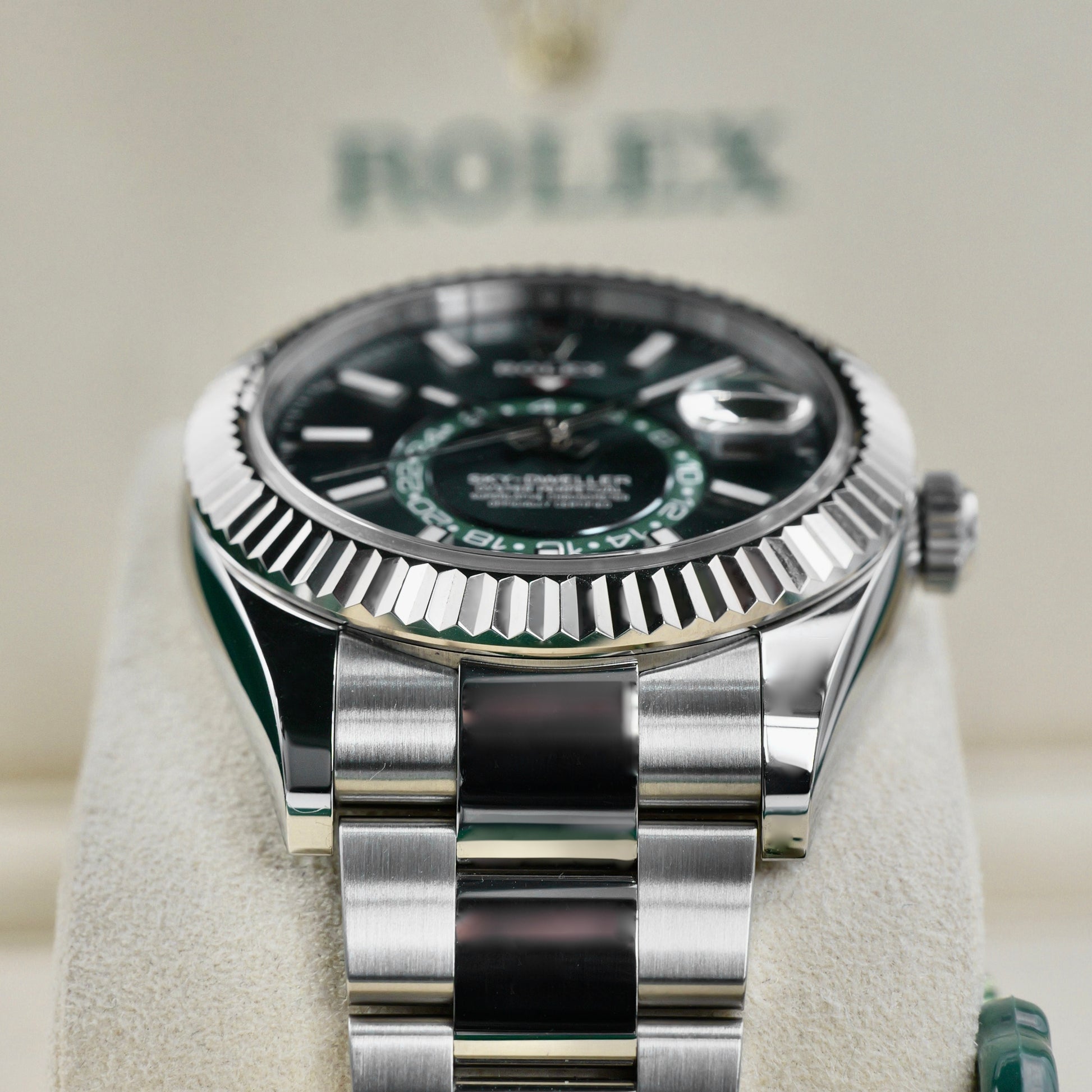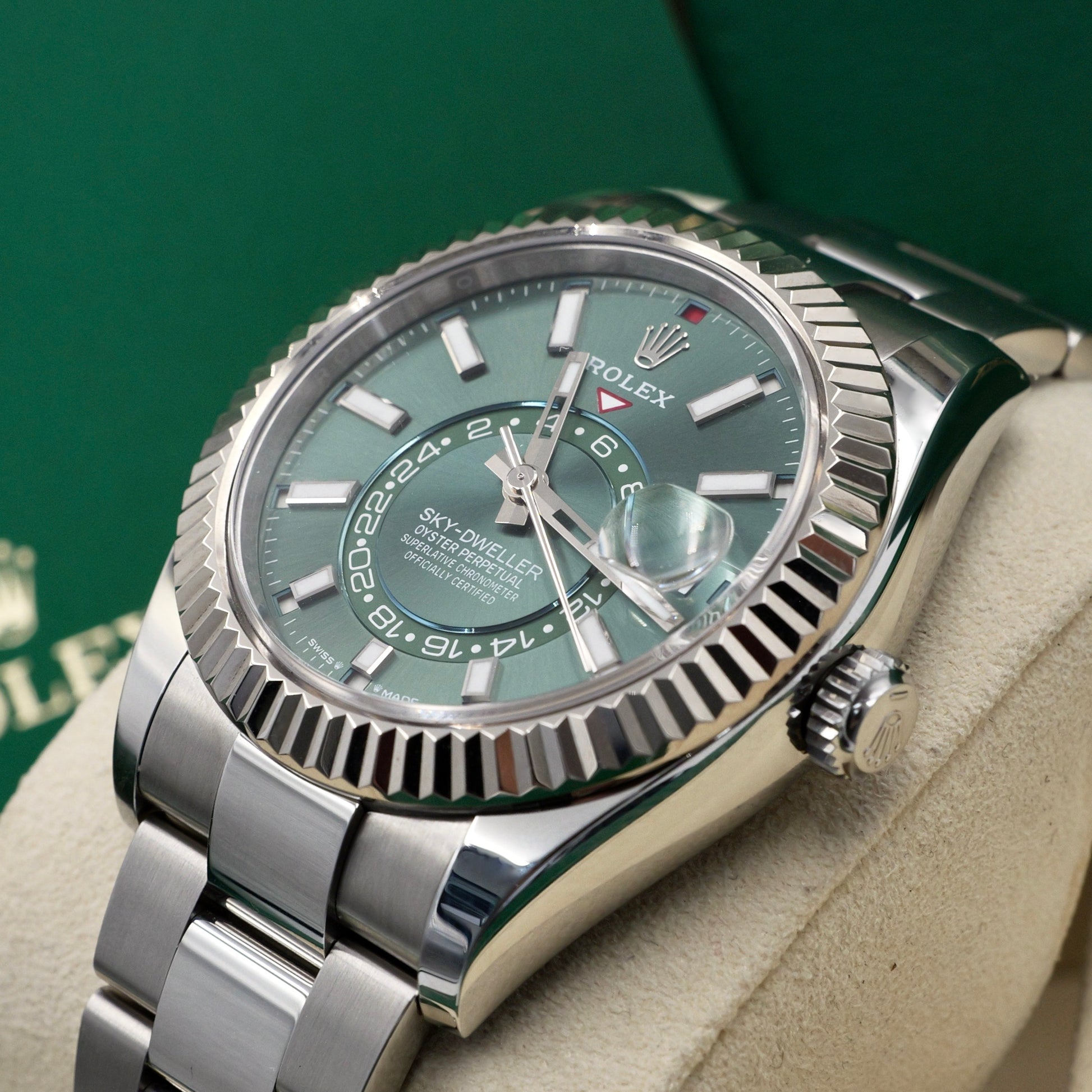 The Rolex Sky-Dweller 336934 with green dial elevates one of Rolex’s most technically advanced timepieces with a fresh, vivid aesthetic. Crafted in Oystersteel and 18k white gold, its 42mm case is framed by the fluted Ring Command bezel, an innovative component that seamlessly controls the watch’s dual time zone and annual calendar functions.