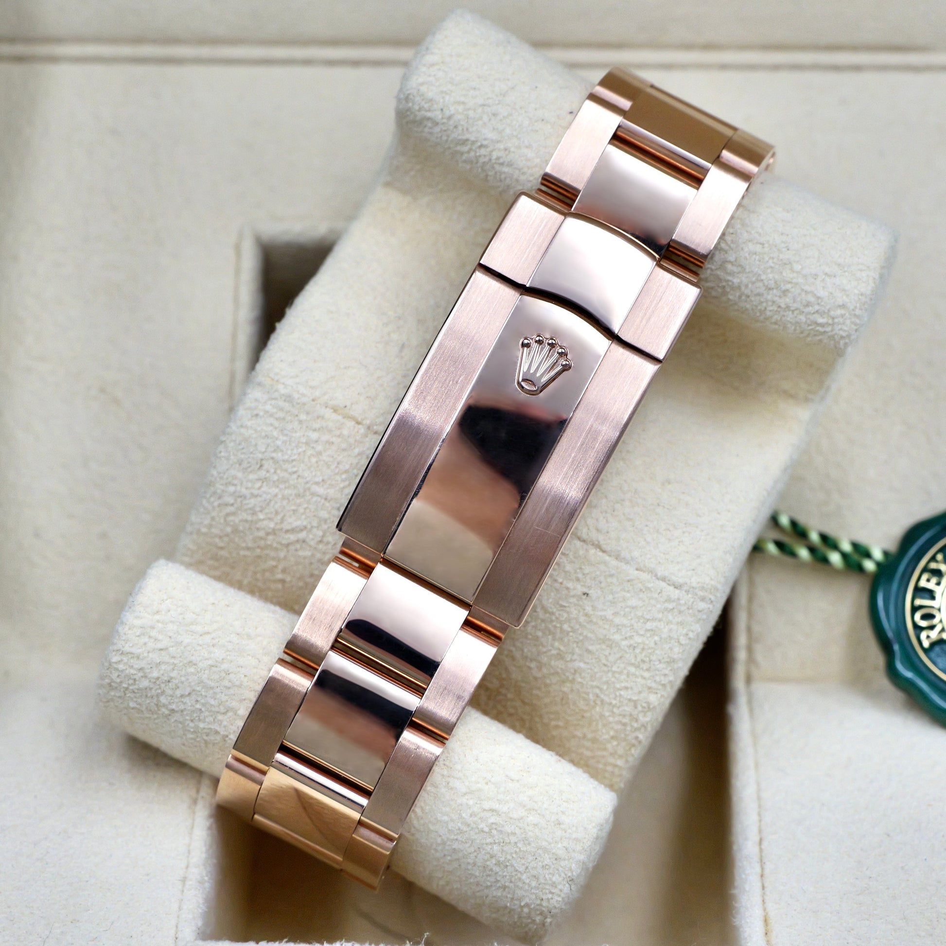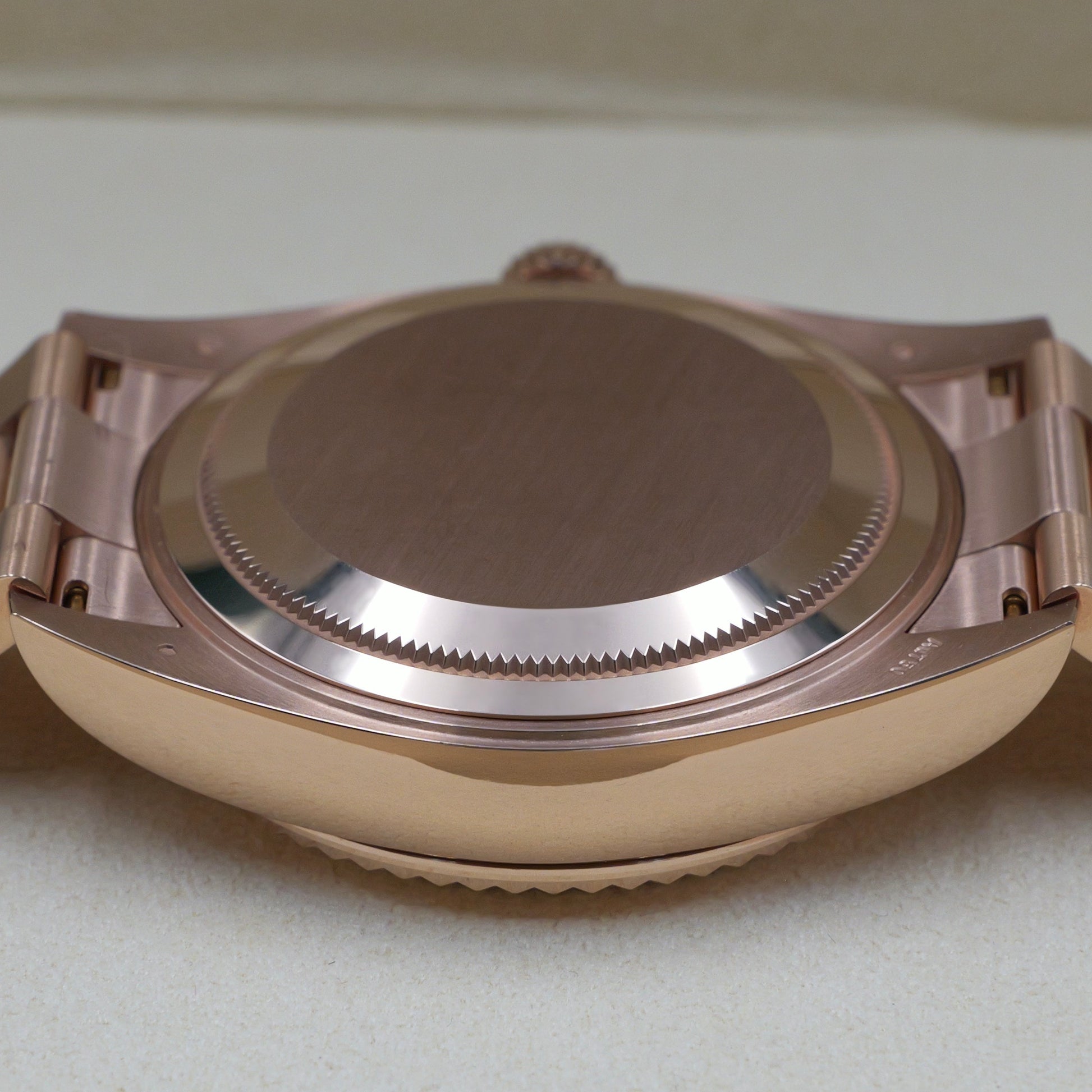 The 42 mm Oyster case is crafted from Rolex’s proprietary 18 ct Everose gold, engineered to maintain its rich hue over time. Its signature fluted bezel is not only a design hallmark but also an integral part of Rolex’s innovative Ring Command system, allowing intuitive adjustment of the watch’s functions directly through the bezel.