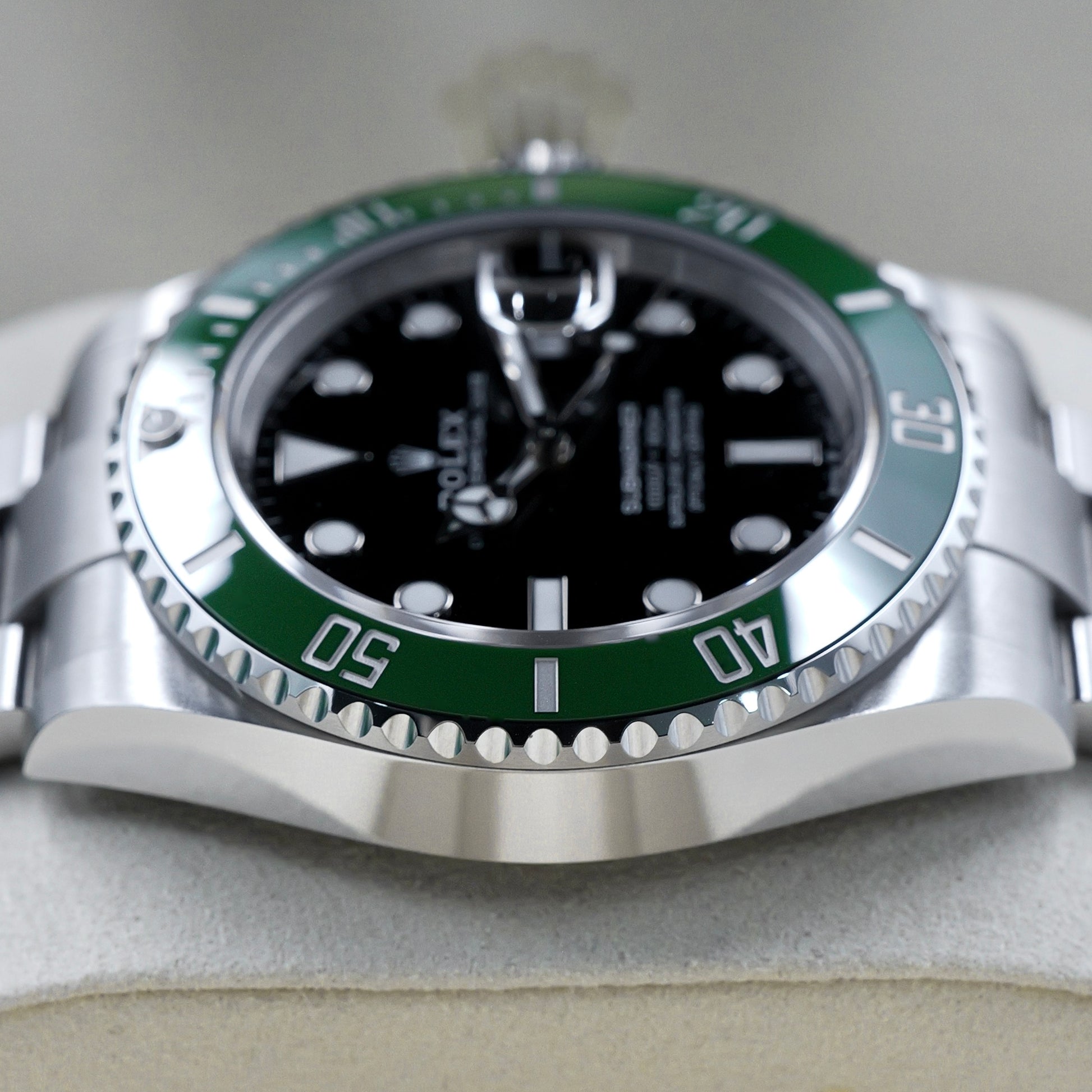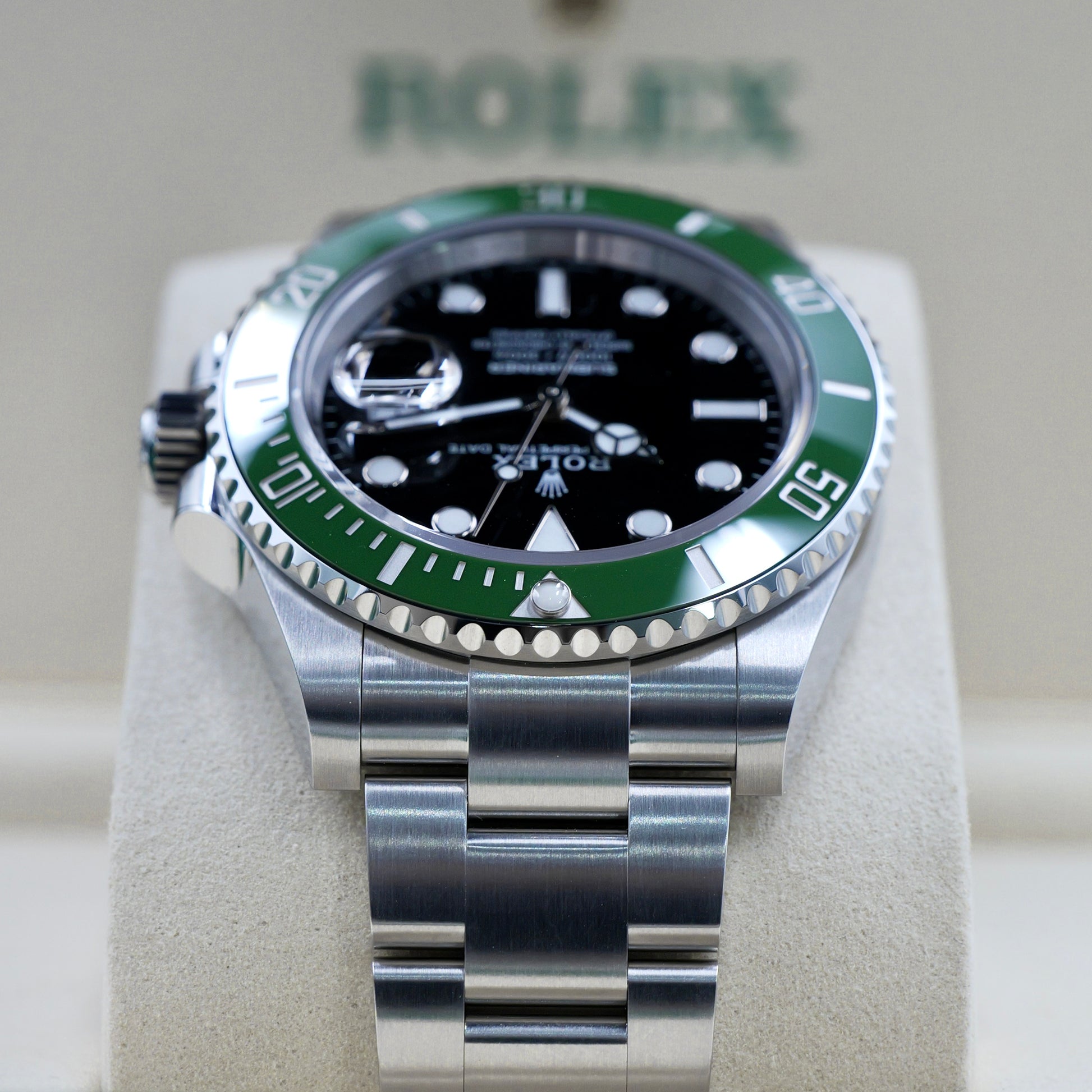 The black lacquer dial offers stark contrast to the green bezel, ensuring high legibility in any condition. Large Chromalight hour markers and Mercedes hands glow a striking blue in low light, while the Cyclops magnifier over the date at 3 o’clock reinforces both function and heritage. The 41mm Oyster case is waterproof to 300 meters and houses the advanced Calibre 3235, offering exceptional precision, shock resistance, and a 70-hour power reserve.