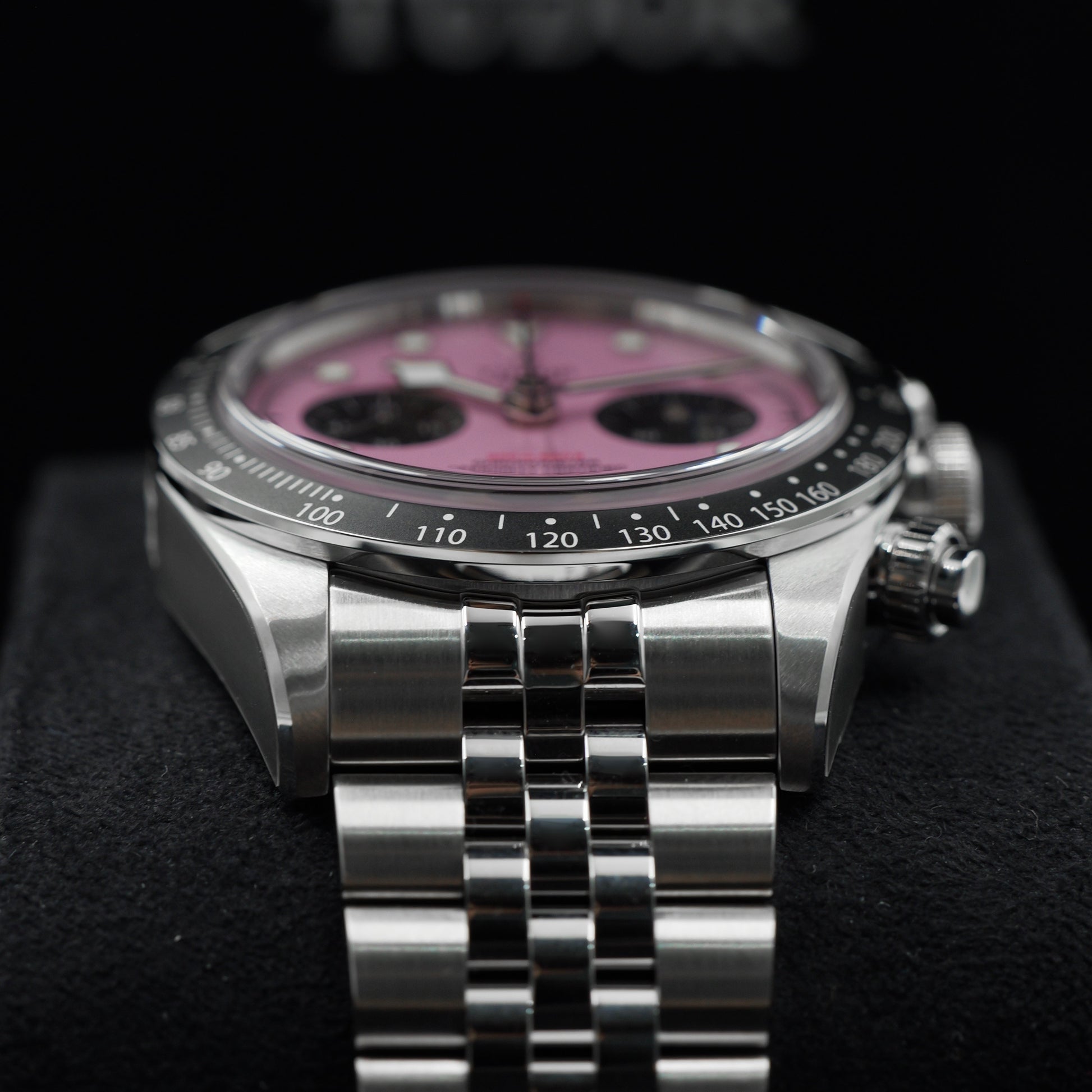 The 41 mm stainless steel case showcases a robust yet balanced profile, finished with a mix of satin brushing and polished accents. A fixed black aluminium tachymeter bezel frames the dial, reinforcing the watch’s racing roots. The black dial is accented by silver-toned chronograph sub-dials in a distinctive “panda-style” layout, ensuring excellent legibility.